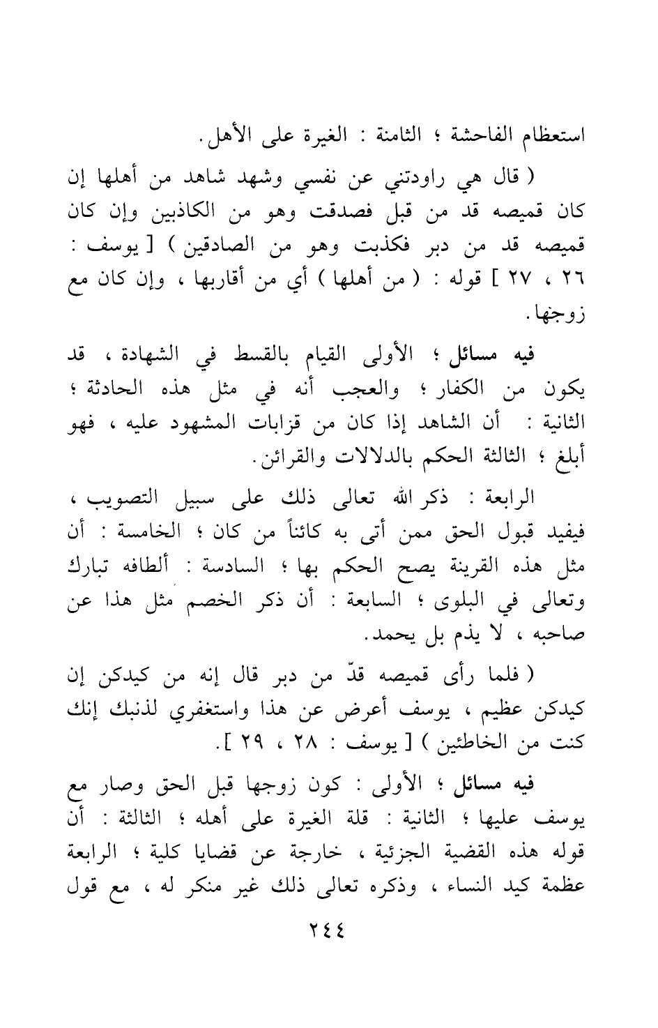 {قَالَ هِيَ رَاوَدَتْنِي عَنْ نَفْسِي وَشَهِدَ شَاهِدٌ مِنْ أَهْلِهَا إِنْ كَانَ قَمِيصُهُ قُدَّ مِنْ قُبُلٍ فَصَدَقَتْ وَهُوَ مِنَ الْكَاذِبِينَ وإِنْ كَانَ قَمِيصُهُ قُدَّ مِنْ دُبُرٍ فَكَذَبَتْ وَهُوَ مِنَ الصَّادِقِينَ} [سورة يوسف آية: 26-27] قوله: {مِنْ أَهْلِهَا} أي من أقاربها، وإن كان مع زوجها.