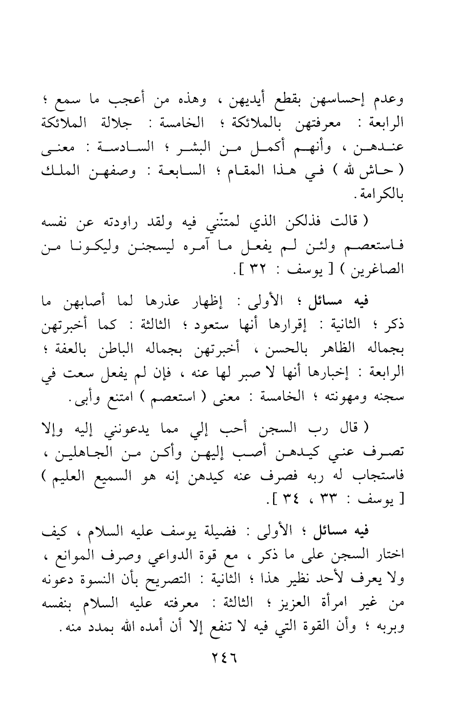 الأولى: فضيلة يوسف عليه السلام، كيف اختار السجن على ما ذكر، مع قوة الدواعي وصرف الموانع، ولا يعرف لأحد نظير هذا.