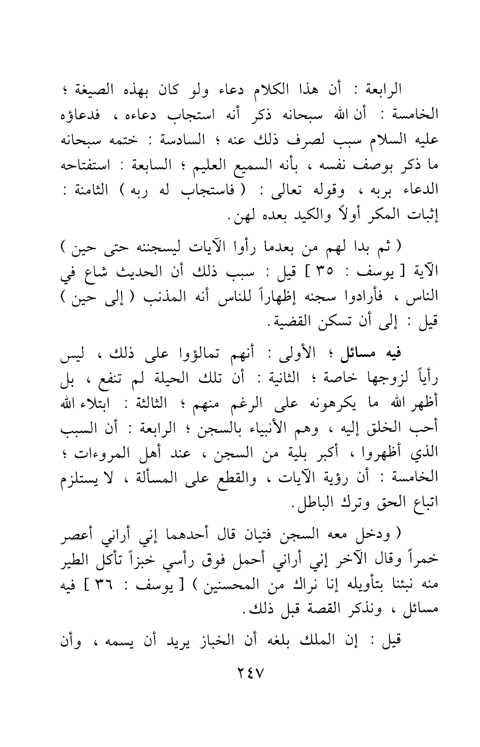 الثالثة: ابتلاء الله أحب الخلق إليه وهم الأنبياء، بالسجن. الرابعة: أن السبب الذي أظهروا أكبر بلية من السجن، عند أهل المروءات. الخامسة: أن رؤية الآيات، والقطع على المسألة، لا يستلزم اتباع الحق وترك الباطل.