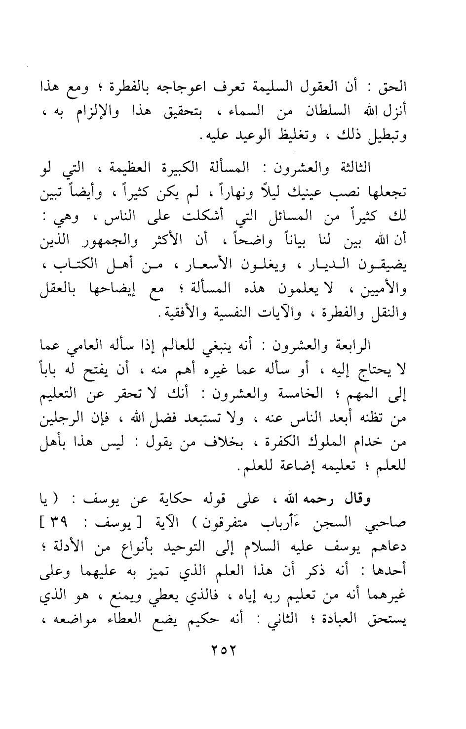 وقال رحمه الله، على قوله حكاية عن يوسف: {يَا صَاحِبَيِ السِّجْنِ أَأَرْبَابٌ مُتَفَرِّقُونَ} [سورة يوسف آية: 39] الآية، دعاهم يوسف عليه السلام إلى التوحيد بأنواع من الأدلة.