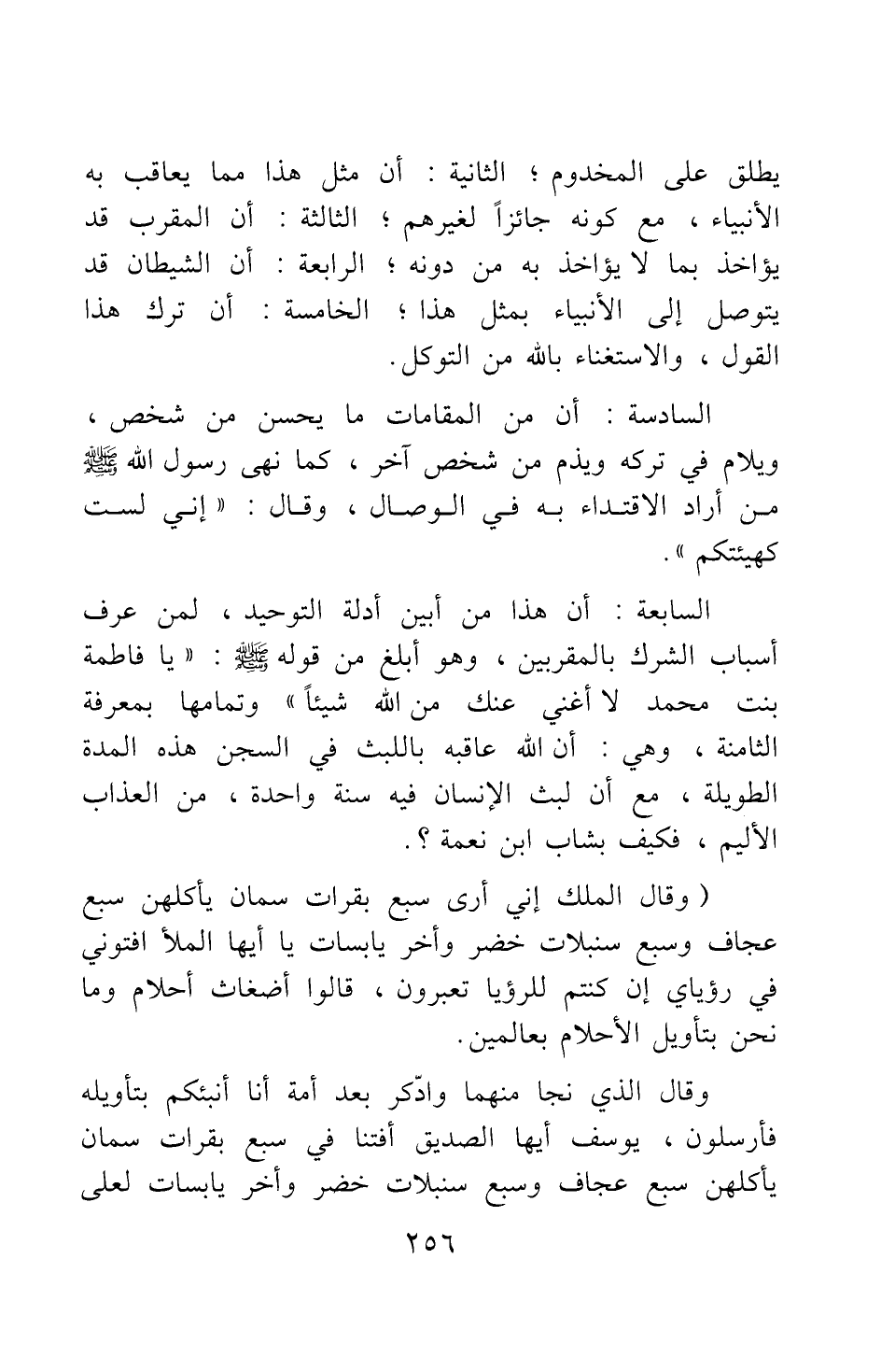 {وَقَالَ الْمَلِكُ إِنِّي أَرَى سَبْعَ بَقَرَاتٍ سِمَانٍ يَأْكُلُهُنَّ سَبْعٌ عِجَافٌ وَسَبْعَ سُنْبُلاتٍ خُضْرٍ وَأُخَرَ يَابِسَاتٍ يَا أَيُّهَا الْمَلأُ أَفْتُونِي فِي رُؤْيايَ إِنْ كُنْتُمْ لِلرُّؤْيا تَعْبُرُونَ قَالُوا أَضْغَاثُ أَحْلامٍ وَمَا نَحْنُ بِتَأْوِيلِ الأَحْلامِ بِعَالِمِينَ وَقَالَ الَّذِي نَجَا مِنْهُمَا وَادَّكَرَ بَعْدَ أُمَّةٍ أَنَا أُنَبِّئُكُمْ بِتَأْوِيلِهِ فَأَرْسِلُونِ يُوسُفُ أَيُّهَا الصِّدِّيقُ أَفْتِنَا فِي سَبْعِ بَقَرَاتٍ سِمَانٍ يَأْكُلُهُنَّ سَبْعٌ عِجَافٌ وَسَبْعِ سُنْبُلاتٍ خُضْرٍ وَأُخَرَ يَابِسَاتٍ لَعَلِّي
