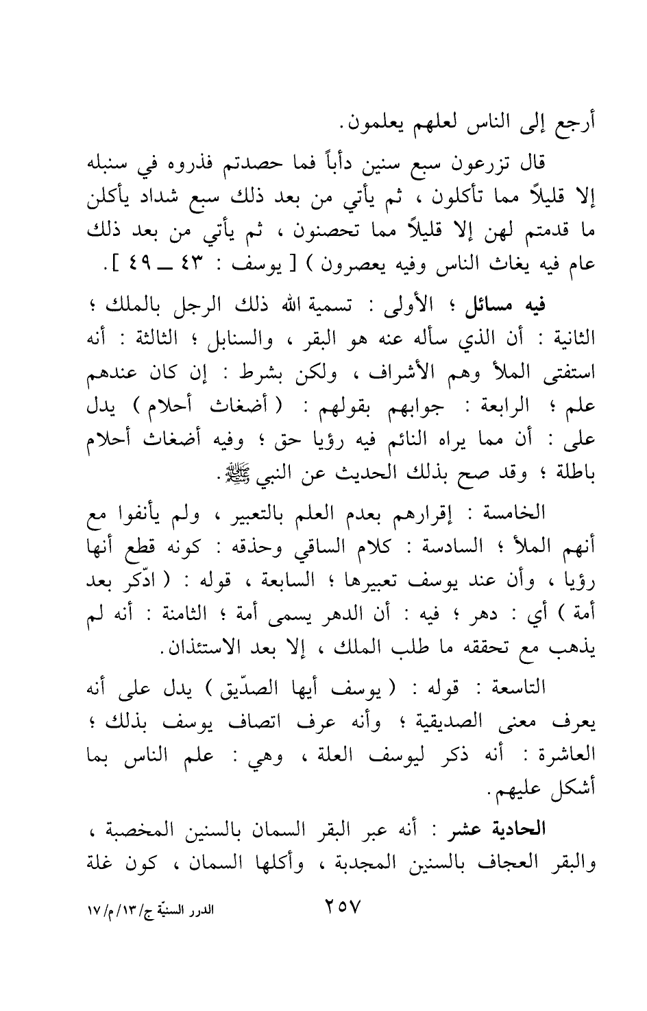 أَرْجِعُ إِلَى النَّاسِ لَعَلَّهُمْ يَعْلَمُونَ قَالَ تَزْرَعُونَ سَبْعَ سِنِينَ دَأَباً فَمَا حَصَدْتُمْ فَذَرُوهُ فِي سُنْبُلِهِ إِلاّ قَلِيلاً مِمَّا تَأْكُلُونَ ثُمَّ يَأْتِي مِنْ بَعْدِ ذَلِكَ سَبْعٌ شِدَادٌ يَأْكُلْنَ مَا قَدَّمْتُمْ لَهُنَّ إِلاّ قَلِيلاً مِمَّا تُحْصِنُونَ ثُمَّ يَأْتِي مِنْ بَعْدِ ذَلِكَ عَامٌ فِيهِ يُغَاثُ النَّاسُ وَفِيهِ يَعْصِرُونَ} [سورة يوسف آية: 43-49] .
