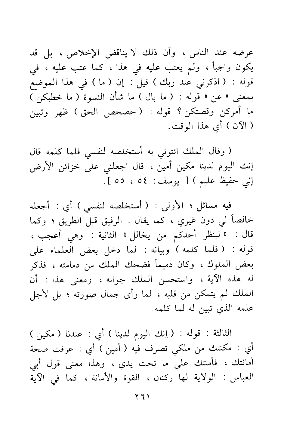 عرضه عند الناس، وأن ذلك لا يناقض الإخلاص، بل قد يكون واجبا، ولم يعتب عليه في هذا كما عتب عليه، في قوله: {اذْكُرْنِي عِنْدَ رَبِّكَ} قيل: إن {ما} في هذا الموضع بمعنى "عن" قوله: {مَا بَالُ} ما شأن النسوة {ما خطبكن} ما أمركن وقصتكن؟ قوله: {حَصْحَصَ الْحَقُّ} ظهر وتبين {الآنَ} أي هذا الوقت.