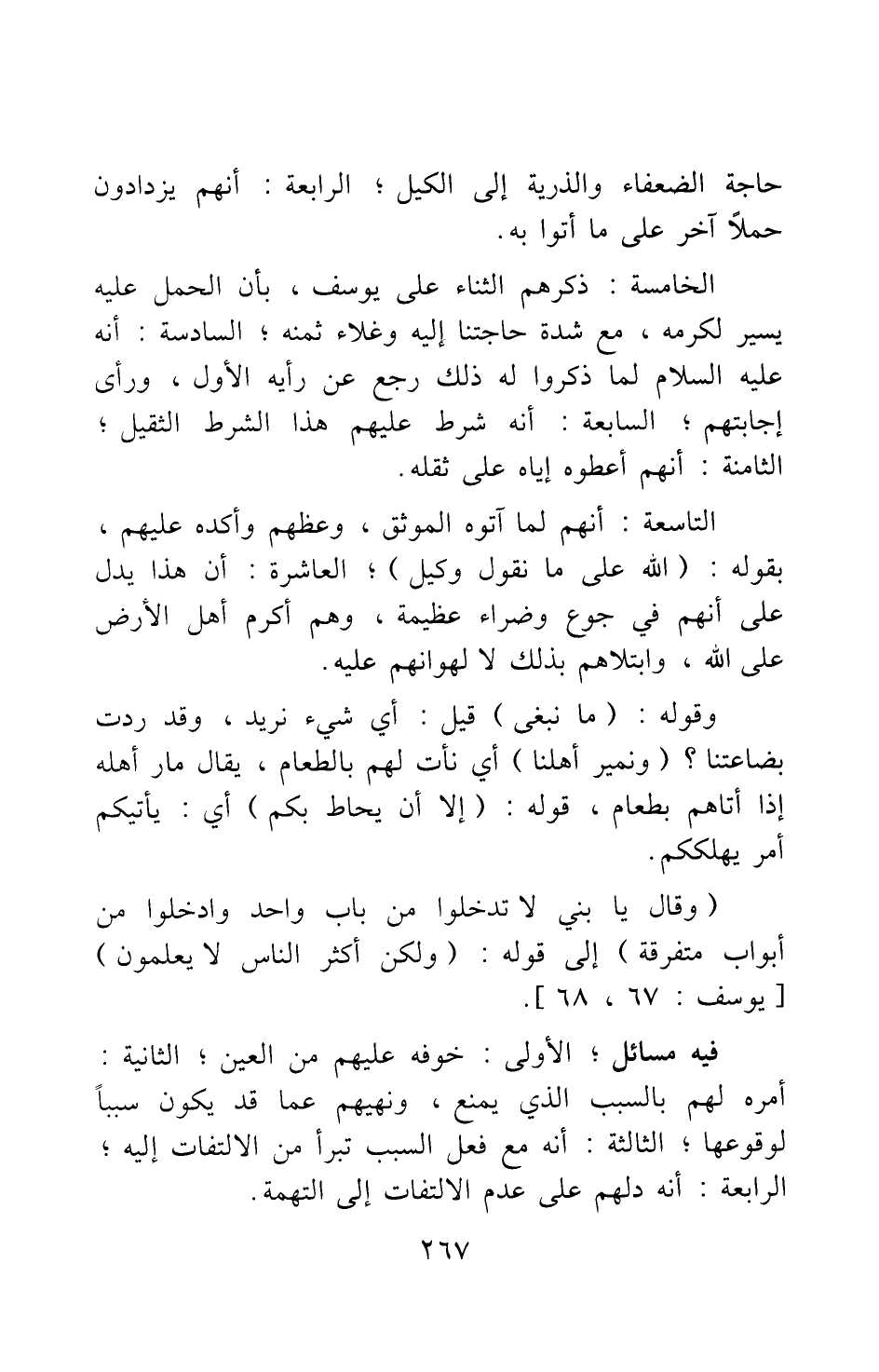 {وَقَالَ يَا بَنِيَّ لا تَدْخُلُوا مِنْ بَابٍ وَاحِدٍ وَادْخُلُوا مِنْ أَبْوَابٍ مُتَفَرِّقَةٍ} [سورة يوسف آية: 67] إلى قوله: {وَلَكِنَّ أَكْثَرَ النَّاسِ لا يَعْلَمُونَ} [سورة يوسف آية: 68] .
