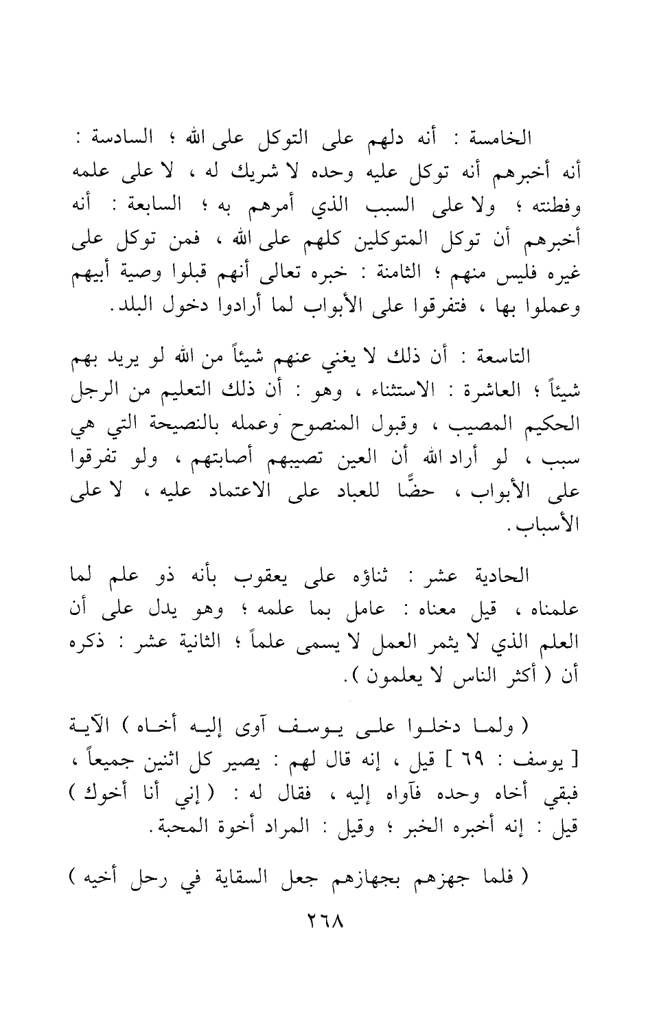 العاشرة: الاستثناء، وهو: أن ذلك التعليم من الرجل الحكيم المصيب، وقبول المنصوح وعمله بالنصيحة التي هي سبب، لو أراد الله أن العين تصيبهم أصابتهم ولو تفرقوا على الأبواب، حضا للعباد على الاعتماد عليه لا على الأسباب.