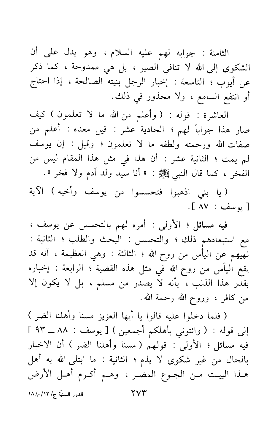 الثامنة: جوابه لهم عليه السلام، وهو يدل على أن الشكوى إلى الله لا تنافي الصبر، بل هي ممدوحة، كما ذكر عن أيوب.