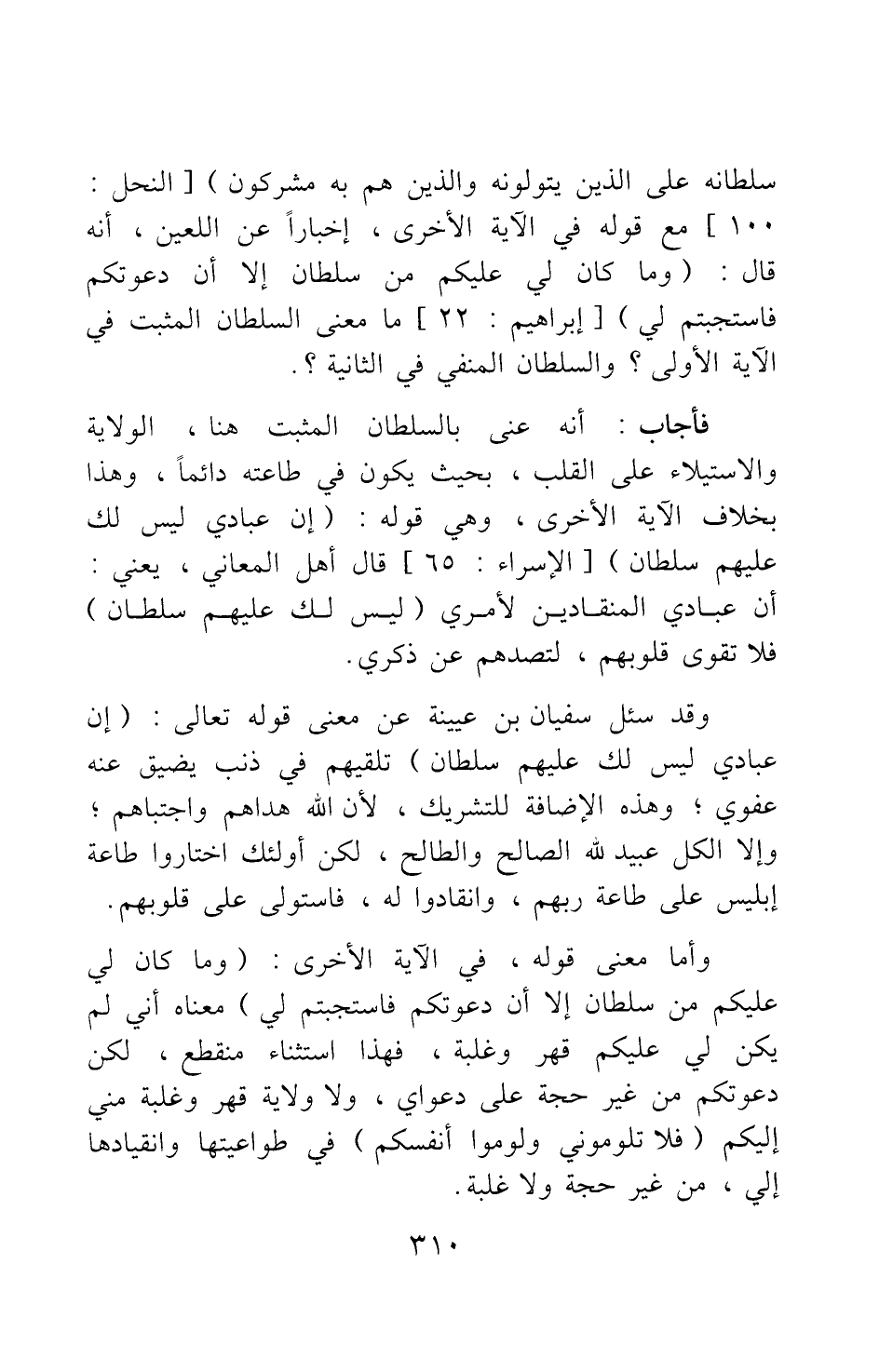 وقد سئل سفيان بن عيينة عن معنى قوله تعالى: {إِنَّ عِبَادِي لَيْسَ لَكَ عَلَيْهِمْ سُلْطَانٌ} [سورة الحجر آية: 42] "تلقيهم في ذنب يضيق عنه عفوي; وهذه الإضافة للتشريك، لأن الله هداهم واجتباهم، وإلا الكل عبيد لله الصالح والطالح، لكن أولئك اختاروا طاعة إبليس على طاعة ربهم، وانقادوا له، فاستولى على قلوبهم" وأما معنى قوله، في الآية الأخرى: {وَمَا كَانَ لِيَ عَلَيْكُمْ مِنْ سُلْطَانٍ إِلاّ أَنْ دَعَوْتُكُمْ فَاسْتَجَبْتُمْ لِي} [سورة إبراهيم آية: 22] معناه أني لم يكن لي عليكم قهر وغلبة، فهذا استثناء منقطع، لكن دعوتكم من غير حجة على دعواي، ولا ولاية قهر وغلبة مني إليكم. {فَلا تَلُومُونِي وَلُومُوا أَنْفُسَكُمْ} [سورة إبراهيم آية: 22] في طواعيتها وانقيادها إلي، من غير حجة ولا غلبة.