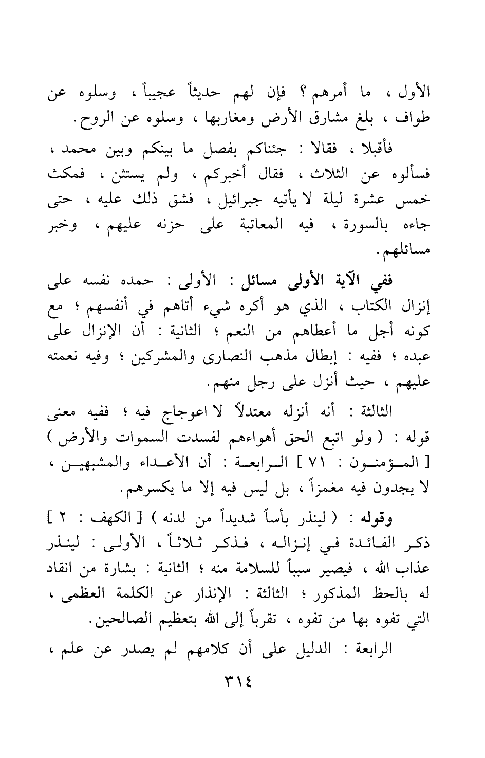 الأول، ما أمرهم؟ فإن لهم حديثا عجيبا. وسلوه عن طواف بلغ مشارق الأرض ومغاربها. وسلوه عن الروح. فأقبلا، فقالا: جئناكم بفصل ما بينكم وبين محمد، فسألوه عن الثلاث، فقال: أخبركم، ولم يستثن. فمكث خمس عشرة ليلة لا يأتيه جبرائيل، فشق ذلك عليه، حتى جاءه بالسورة فيه المعاتبة على حزنه عليهم، وخبر مسائلهم" ففي الآية الأولى مسائل: