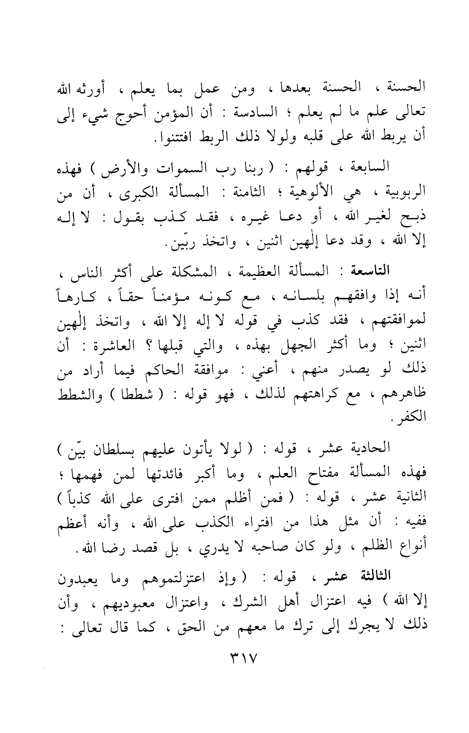 التاسعة: المسألة العظيمة المشكلة على أكثر الناس، أنه إذا وافقهم بلسانه، مع كونه مؤمنا حقا، كارها لموافقتهم، فقد كذب في قوله لا إله إلا الله، واتخذ إلهين اثنين; وما أكثر الجهل بهذه، والتي قبلها!