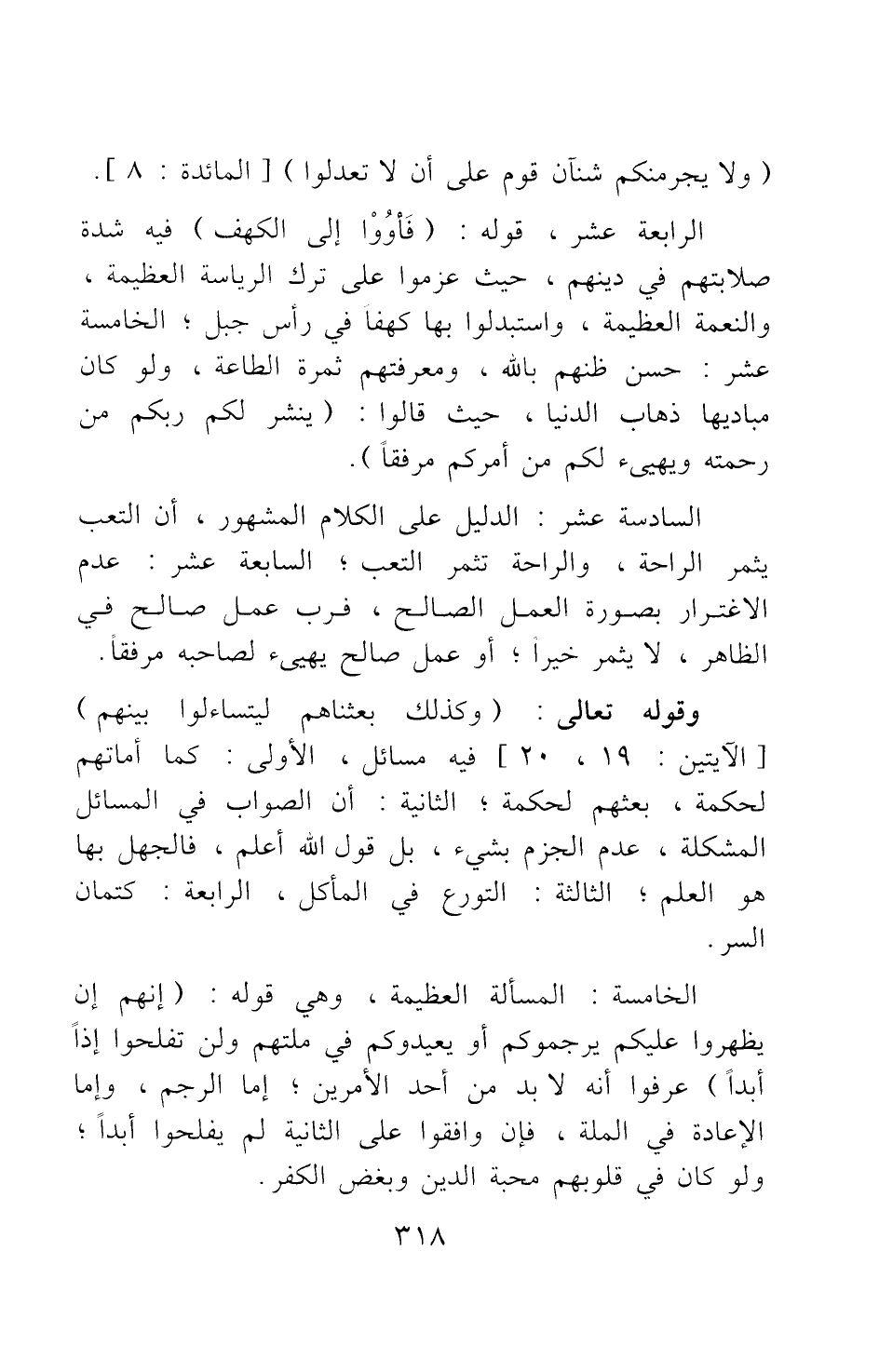الخامسه: المسألة العظيمة، وهي قوله: إِنَّهُمْ إِنْ يَظْهَرُوا عَلَيْكُمْ يَرْجُمُوكُمْ أَوْ يُعِيدُوكُمْ فِي مِلَّتِهِمْ وَلَنْ تُفْلِحُوا إِذاً أَبَداً} [سورة الكهف آية: 20] : عرفوا أنه لا بد من أحد الأمرين; إما الرجم، وإما الإعادة في الملة، فإن وافقوا على الثانية لم يفلحوا أبدا، ولو كان في قلوبهم محبة الدين وبغض الكفر.