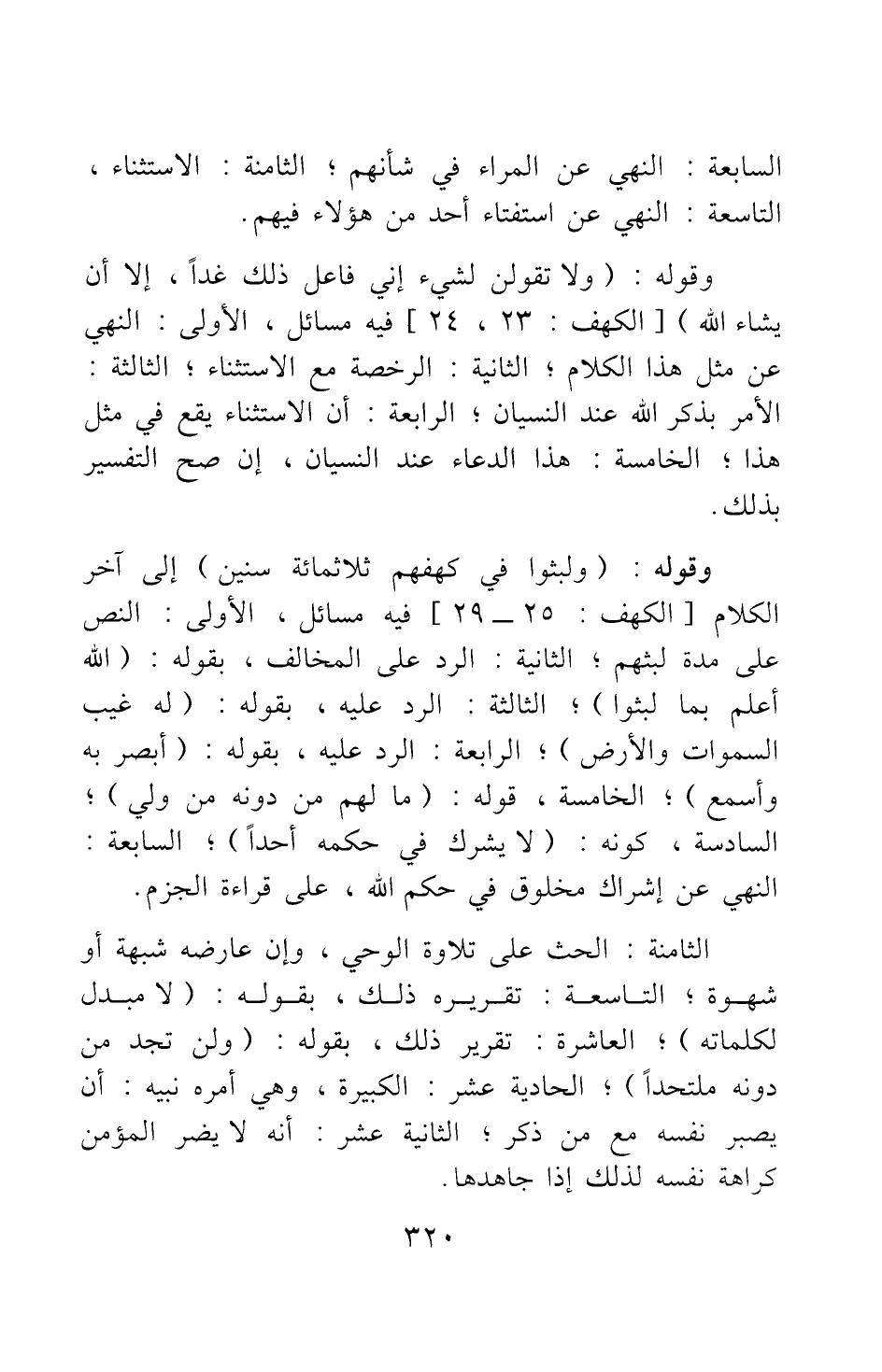 وقوله: {وَلا تَقُولَنَّ لِشَيْءٍ إِنِّي فَاعِلٌ ذَلِكَ غَداً، إلا أن يشاء الله} [سورة الكهف آية: 23-24] فيه مسائل: