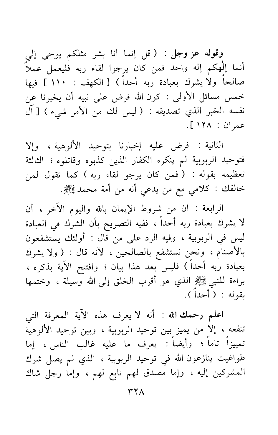 اعلم رحمك الله: أنه لا يعرف هذه الآية المعرفة التي تنفعه، إلا من يميز بين توحيد الربوبية وبين توحيد الألوهية تمييزا تاما; وأيضا يعرف ما عليه غالب الناس، إما طواغيت ينازعون الله في توحيد الربوبية الذي لم يصل شرك المشركين إليه، وإما مصدق لهم تابع لهم، وإما رجل شاك