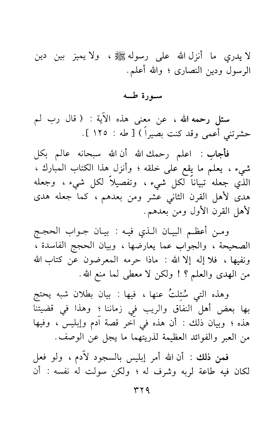 فأجاب: اعلم رحمك الله أن الله سبحانه عالم بكل شيء، يعلم ما يقع على خلقه، وأنزل هذا الكتاب المبارك الذي جعله تبيانا لكل شيء وتفصيلا لكل شيء، وجعله هدى لأهل القرن الثاني عشر ومن بعدهم، كما جعله هدى لأهل القرن الأول ومن بعدهم.