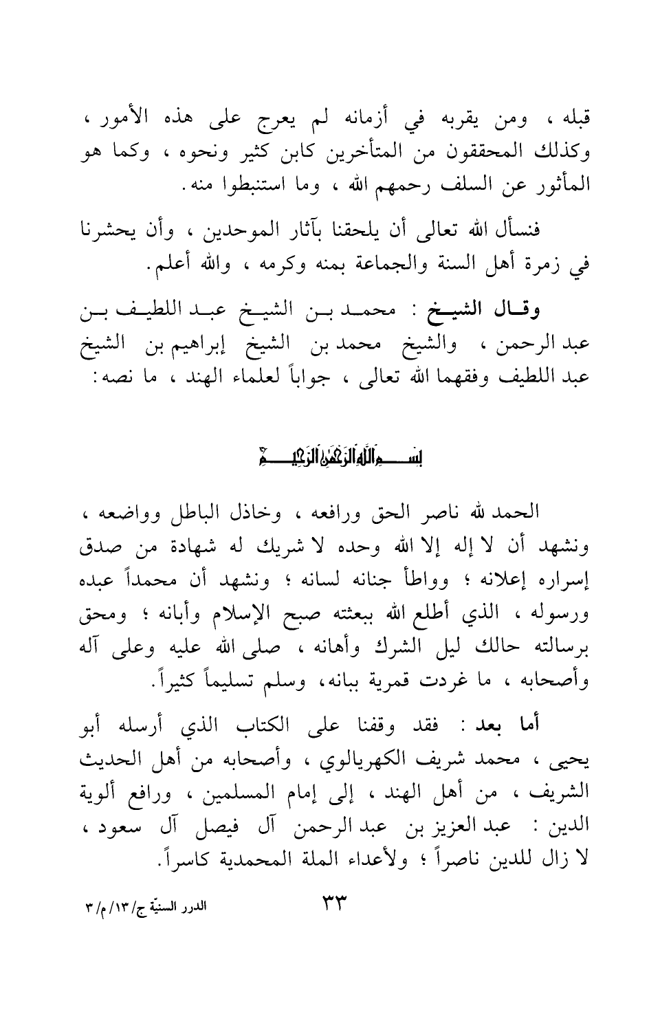 أما بعد: فقد وقفنا على الكتاب الذي أرسله أبو يحيى محمد شريف الكهريالوي، وأصحابه من أهل الحديث الشريف، من أهل الهند، إلى إمام المسلمين، ورافع ألوية الدين: عبد العزيز بن عبد الرحمن آل فيصل آل سعود، لا زال للدين ناصرا ; ولأعداء الملة المحمدية كاسرا.