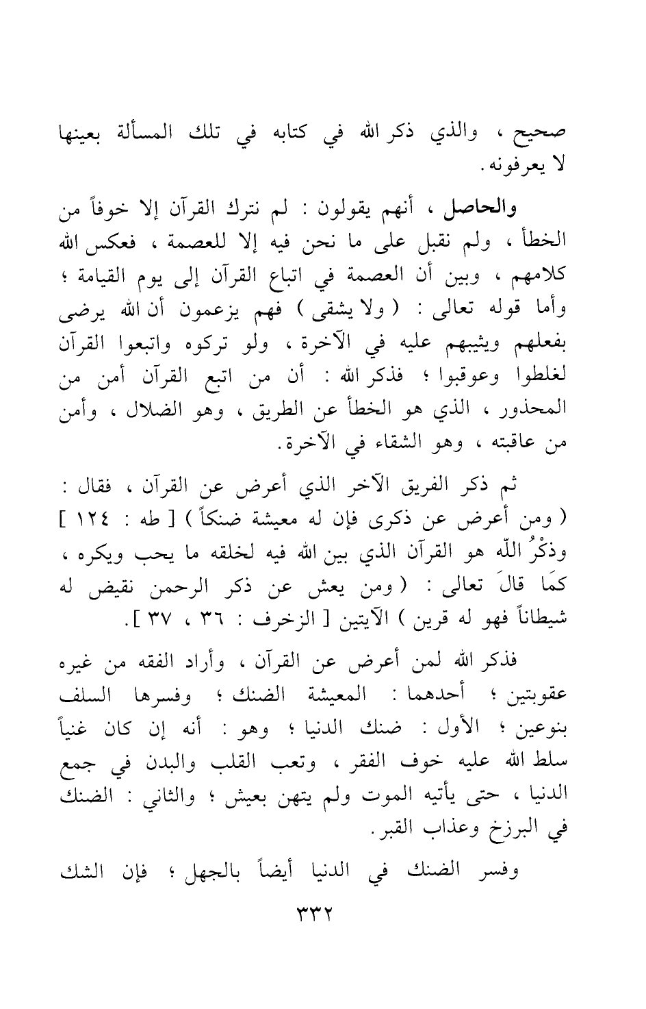 والحاصل، أنهم يقولون: لم نترك القرآن إلا خوفا من الخطأ، ولم نقبل على ما نحن فيه إلا للعصمة، فعكس الله كلامهم، وبين أن العصمة في اتباع القرآن إلى يوم القيامة. وأما قوله تعالى: {وَلا يَشْقَى (: فهم يزعمون أن الله يرضى بفعلهم ويثيبهم عليه في الآخرة ولو تركوه واتبعوا القرآن لغلطوا وعوقبوا، فذكر الله أن من اتبع القرآن أمن من المحذور، الذي هو الخطأ عن الطريق وهو الضلال، وأمن من عاقبته وهو الشقاء في الآخرة.