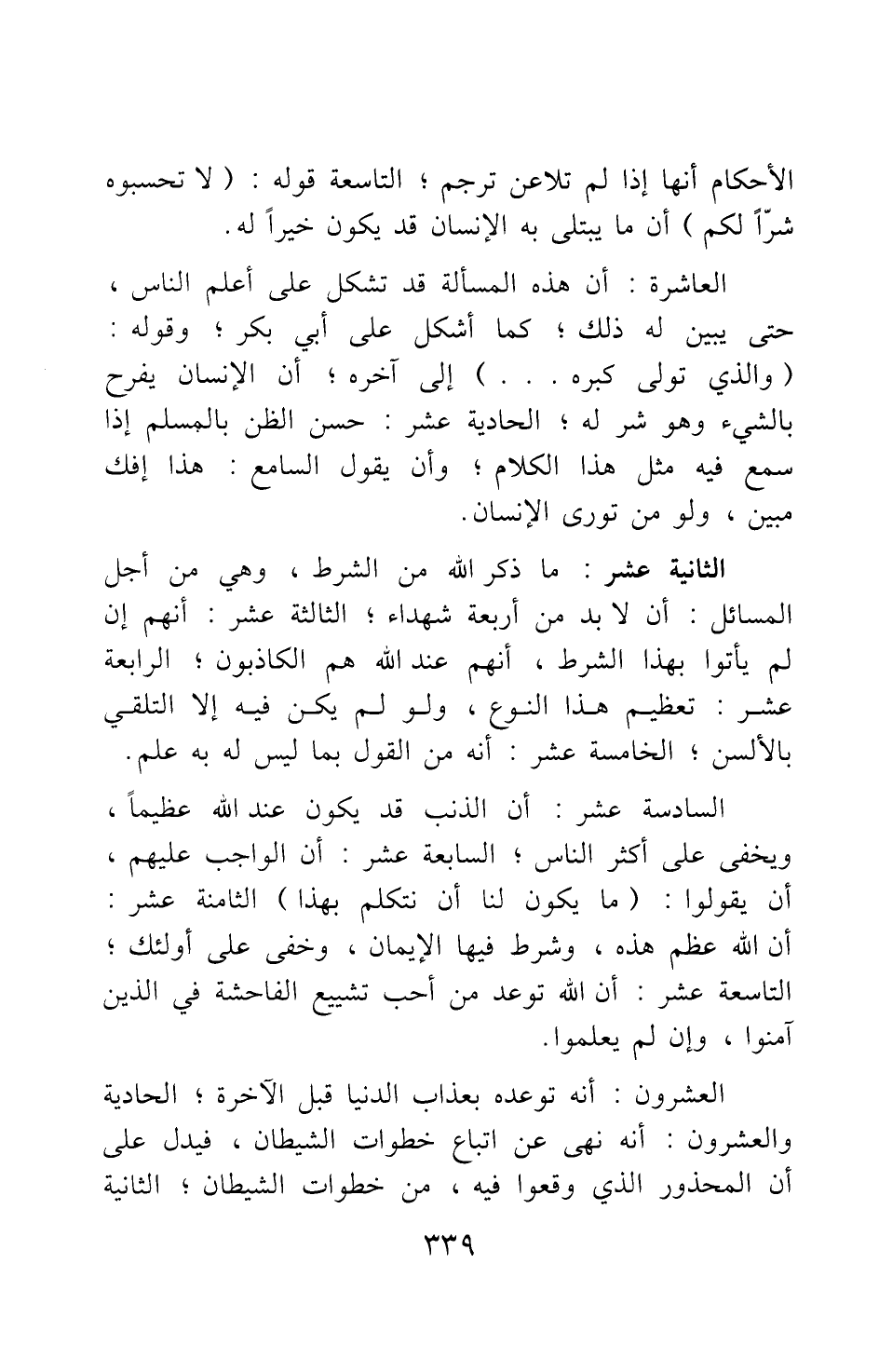 التاسعة: قوله {لا تَحْسَبُوهُ شَرّاً لَكُمْ} [سورة النور آية: 11] أن ما يبتلى به الإنسان قد يكون خيرا له.