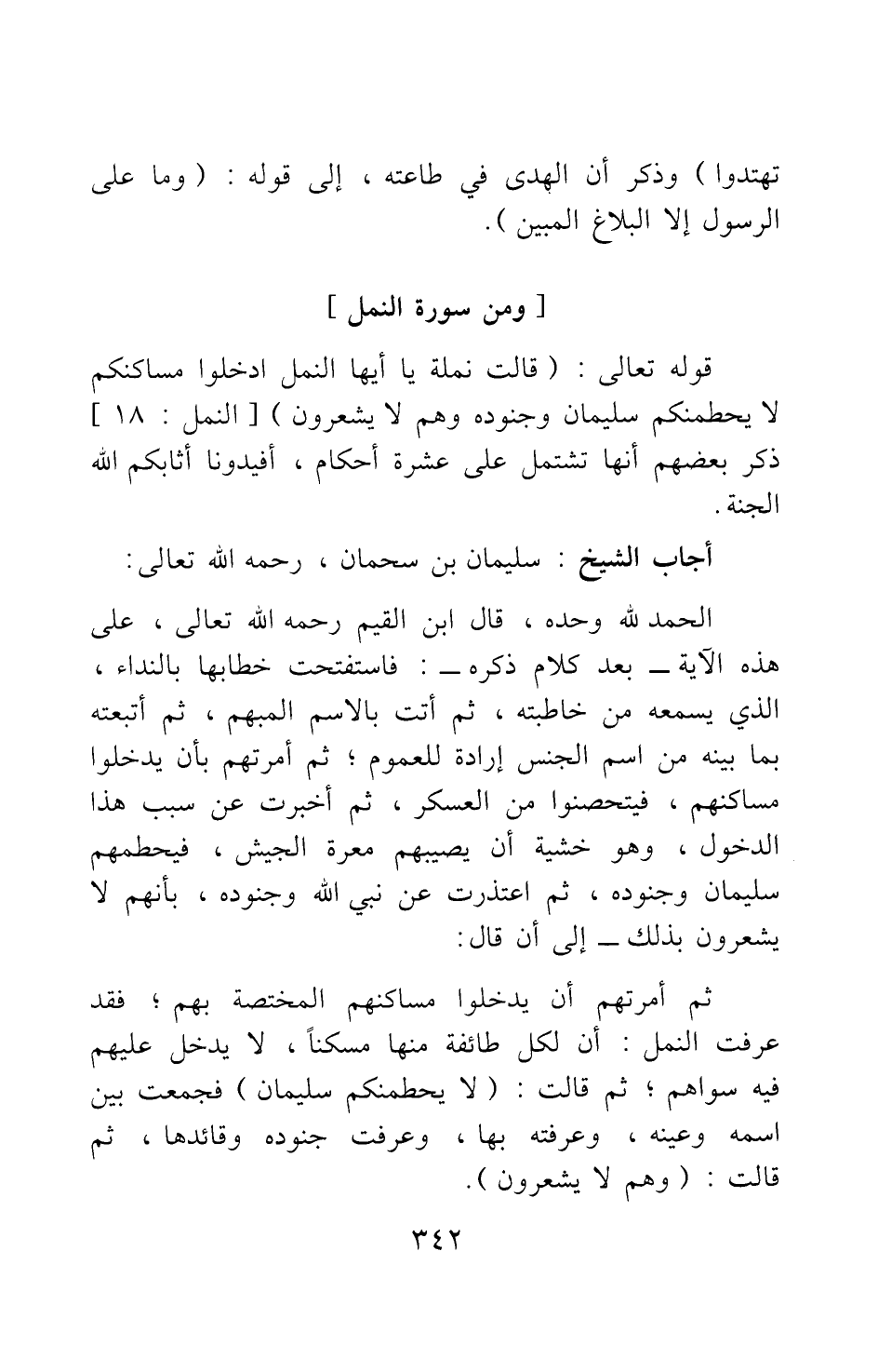أجاب الشيخ: سليمان بن سحمان، رحمه الله تعالى: الحمد لله وحده، قال ابن القيم رحمه الله تعالى، على هذه الآية - بعد كلام ذكره -: فاستفتحت خطابها بالنداء الذي يسمعه من خاطبته، ثم أتت بالاسم المبهم، ثم أتبعته بما بينه من اسم الجنس إرادة للعموم; ثم أمرتهم بأن يدخلوا مساكنهم، فيتحصنوا من العسكر، ثم أخبرت عن سبب هذا الدخول، وهو خشية أن يصيبهم معرة الجيش، فيحطمهم سليمان وجنوده، ثم اعتذرت عن نبي الله وجنوده بأنهم لا يشعرون بذلك ... إلى أن قال: