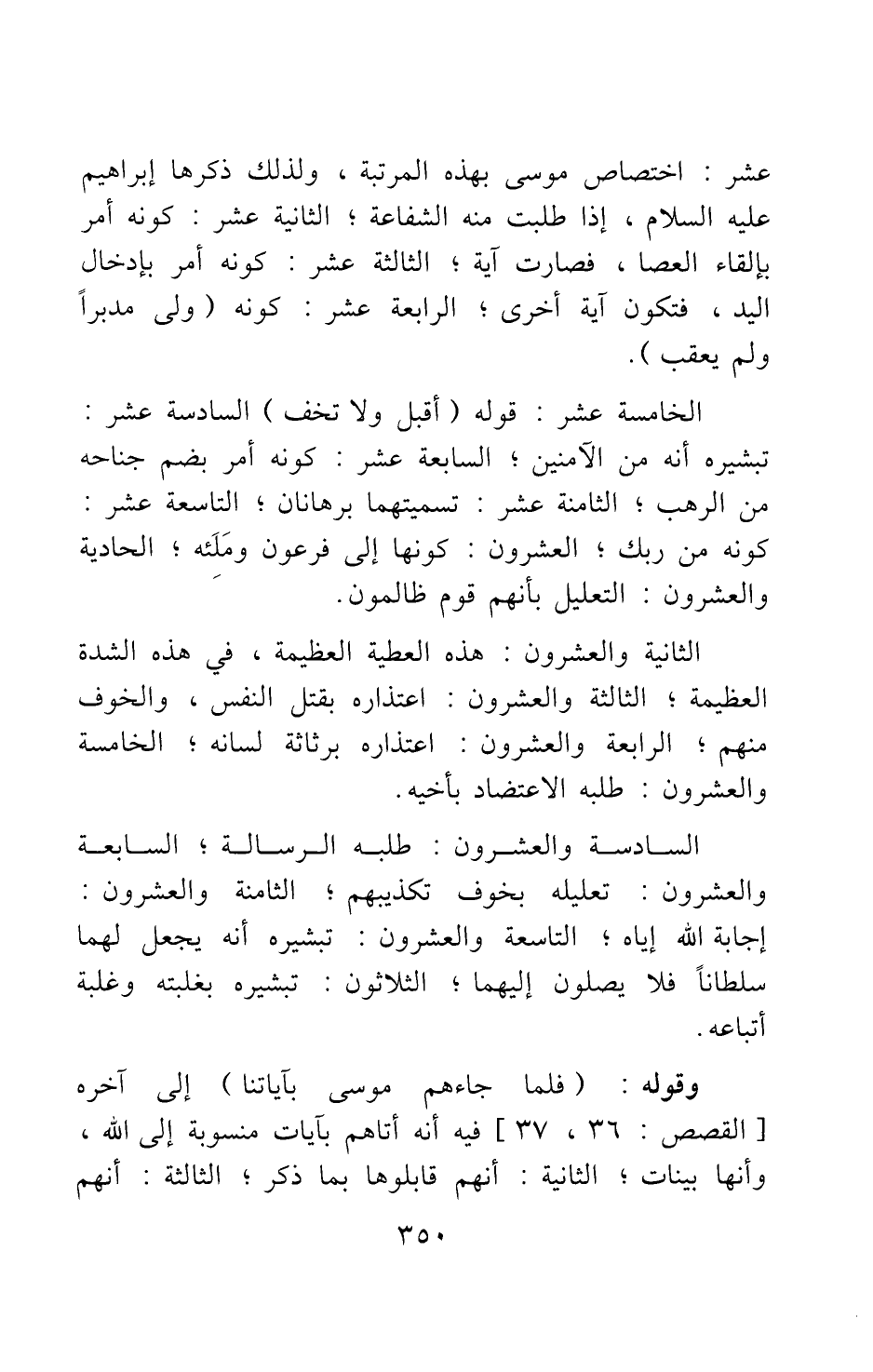 عشر: اختصاص موسى بهذه المرتبة، ولذلك ذكرها إبراهيم عليه السلام، إذا طلبت منه الشفاعة الثانية عشر: كونه أمر بإلقاء العصا، فصارت آية.