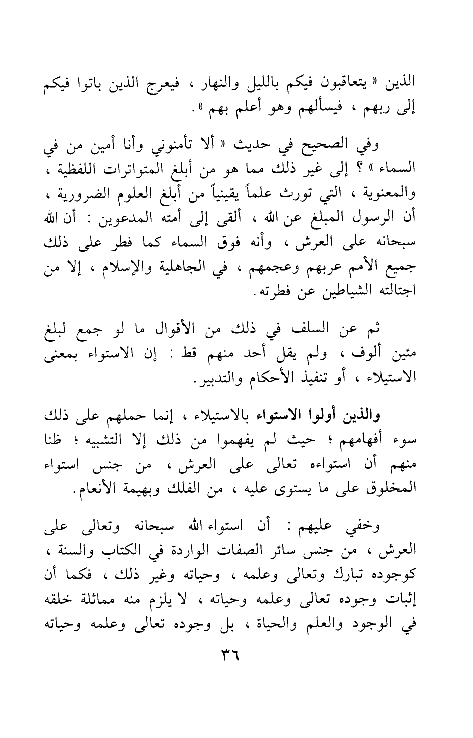وفي الصحيح في حديث: " ألا تأمنوني وأنا أمين من في السماء؟ "2 إلى غير ذلك مما هو من أبلغ المتواترات اللفظية والمعنوية، التي تورث علما يقينيا من أبلغ العلوم الضرورية، أن الرسول المبلغ عن الله ألقى إلى أمته المدعوين أن الله سبحانه على العرش، وأنه فوق السماء، كما فطر على ذلك جميع الأمم عربهم وعجمهم، في الجاهلية والإسلام، إلا من اجتالته الشياطين عن فطرته. ثم عن السلف في ذلك من الأقوال ما لو جمع لبلغ مئين ألوف، ولم يقل أحد منهم قط: إن الاستواء بمعنى الاستيلاء، أو تنفيذ الأحكام والتدبير.