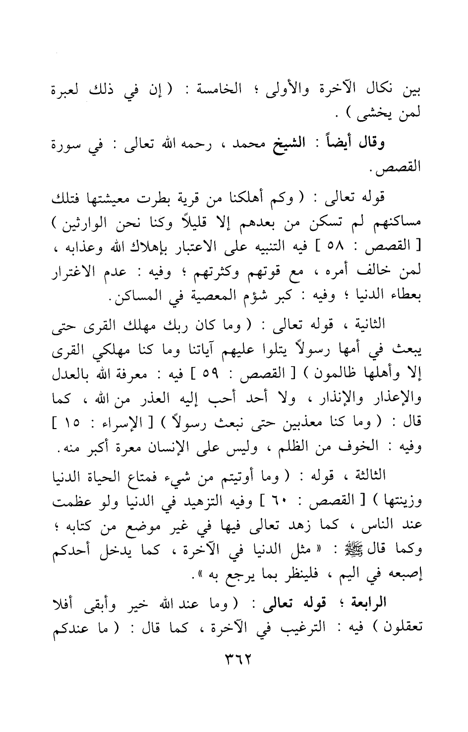 وقال أيضا الشيخ محمد، رحمه الله تعالى: في سورة القصص: قوله تعالى: وَكَمْ أَهْلَكْنَا مِنْ قَرْيَةٍ بَطِرَتْ مَعِيشَتَهَا فَتِلْكَ مَسَاكِنُهُمْ لَمْ تُسْكَنْ مِنْ بَعْدِهِمْ إِلاّ قَلِيلاً وَكُنَّا نَحْنُ الْوَارِثِينَ} [سورة القصص آية: 58] : فيه: التنبيه على الاعتبار بإهلاك الله وعذابه لمن خالف أمره، مع قوتهم وكثرتهم. وفيه: عدم الاغترار بعطاء الدنيا. وفيه: كبر شؤم المعصية في المساكن.