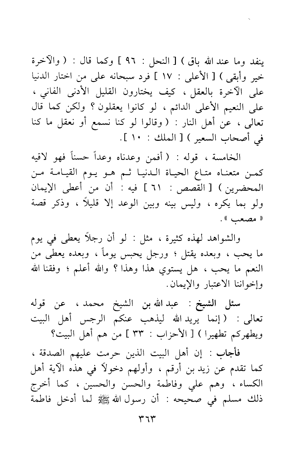 سئل الشيخ: عبد الله بن الشيخ محمد، عن قوله تعالى: {إِنَّمَا يُرِيدُ اللَّهُ لِيُذْهِبَ عَنْكُمُ الرِّجْسَ أَهْلَ الْبَيْتِ وَيُطَهِّرَكُمْ تَطْهِيراً} [سورة الأحزاب آية: 33] ، من هم أهل البيت؟ .