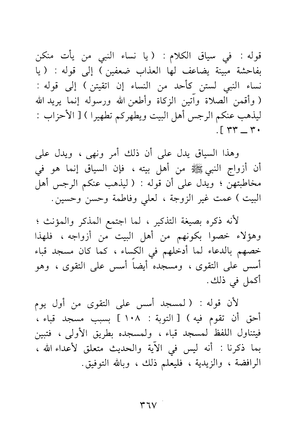 وهذا السياق يدل على أن ذلك أمر ونهي، ويدل على أن أزواج النبي صلى الله عليه وسلم من أهل بيته؛ فإن السياق إنما هو في مخاطبتهن; ويدل على أن قوله: {لِيُذْهِبَ عَنْكُمُ الرِّجْسَ أَهْلَ الْبَيْتِ} [سورة الأحزاب آية: 33] عمت غير الزوجة، لعلي وفاطمة وحسن وحسين؛ لأنه ذكره بصيغة التذكير، لما اجتمع المذكر والمؤنث; وهؤلاء خصوا بكونهم من أهل البيت من أزواجه، فلهذا خصهم بالدعاء لما أدخلهم في الكساء، كما كان مسجد قباء أسس على التقوى، ومسجده أيضا أسس على التقوى، وهو أكمل في ذلك؛ لأن قوله: لَمَسْجِدٌ أُسِّسَ عَلَى التَّقْوَى مِنْ أَوَّلِ يَوْمٍ أَحَقُّ أَنْ تَقُومَ فِيهِ} [سورة التوبة آية: 108] بسبب مسجد قباء، فيتناول اللفظ لمسجد قباء، ولمسجده بطريق الأولى؛ فتبين بما ذكرنا أنه ليس في الآية والحديث متعلق لأعداء الله، الرافضة، والزيدية؛ فليعلم ذلك، وبالله التوفيق.