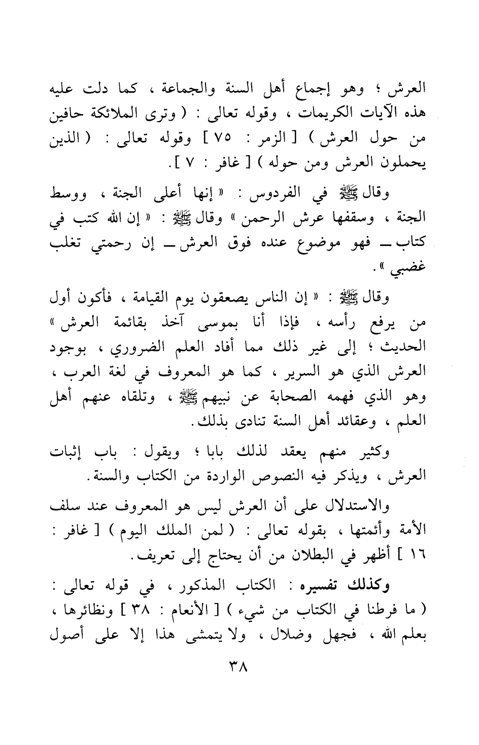 وقال صلى الله عليه وسلم " إن الله كتب في كتاب - فهو موضوع عنده فوق العرش -: إن رحمتي تغلب غضبي " 2، وقال صلى الله عليه وسلم: " إن الناس يصعقون يوم القيامة، فأكون أول من يرفع رأسه، فإذا أنا بموسى آخذ بقائمة العرش" 3 الحديث ; إلى غير ذلك مما أفاد العلم الضروري، بوجود العرش الذي هو السرير، كما هو المعروف في لغة العرب، وهو الذي فهمه الصحابة عن نبيهم صلى الله عليه وسلم، وتلقاه عنهم أهل العلم؛ وعقائد أهل السنة تنادي بذلك.