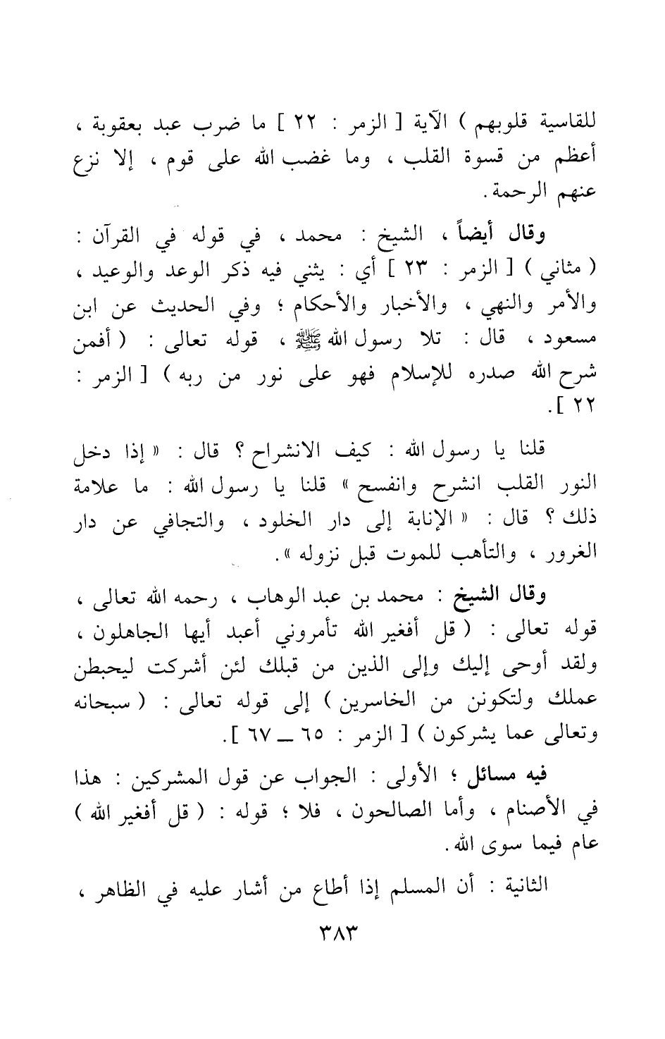 وقال الشيخ محمد بن عبد الوهاب، رحمه الله تعالى: قوله تعالى: {قُلْ أَفَغَيْرَ اللَّهِ تَأْمُرُونِّي أَعْبُدُ أَيُّهَا الْجَاهِلُونَ وَلَقَدْ أُوحِيَ إِلَيْكَ وَإِلَى الَّذِينَ مِنْ قَبْلِكَ لَئِنْ أَشْرَكْتَ لَيَحْبَطَنَّ عَمَلُكَ وَلَتَكُونَنَّ مِنَ الْخَاسِرِينَ} [سورة الزمر آية: 64-65] إلى قوله تعالى: {سُبْحَانَهُ وَتَعَالَى عَمَّا يُشْرِكُونَ} [سورة الزمر آية: 67] : فيه مسائل:
