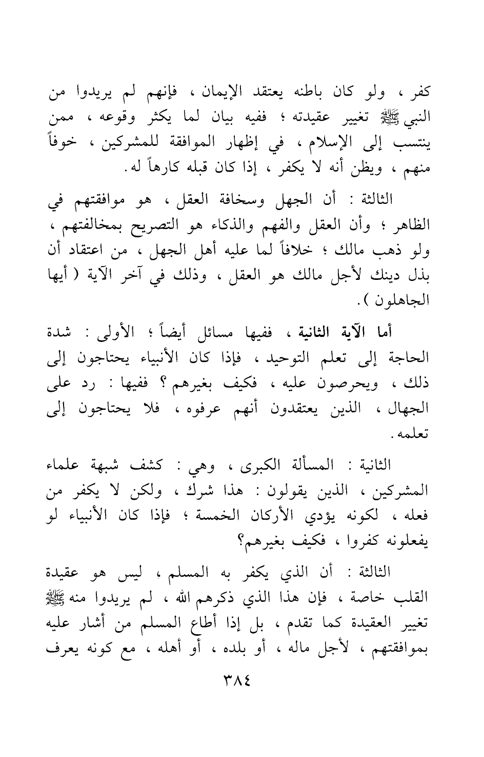 الثانية: المسألة الكبرى، وهي: كشف شبهة علماء المشركين الذين يقولون: هذا شرك ولكن لا يكفر من فعله لكونه يؤدي الأركان الخمسة; فإذا كان الأنبياء لو يفعلونه كفروا، فكيف بغيرهم؟