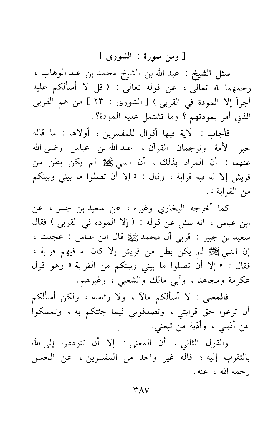 سئل الشيخ: عبد الله بن الشيخ محمد بن عبد الوهاب، رحمهما الله تعالى، عن قوله تعالى: قُلْ لا أَسْأَلُكُمْ عَلَيْهِ أَجْراً إِلاّ الْمَوَدَّةَ فِي الْقُرْبَى [سورة الشورى آية: 23] ، من هم القربى الذي أمر بمودتهم؟ وما تشتمل عليه المودة؟.
