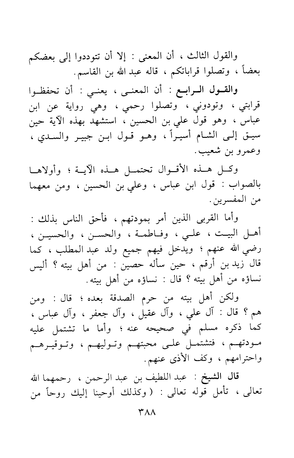وأما القربى الذين أمر بمودتهم، فأحق الناس بذلك: أهل البيت: علي، وفاطمة، والحسن، والحسين، رضي الله عنهم، ويدخل فيهم جميع ولد عبد المطلب، كما قال زيد بن أرقم، حين سأله حصين: من أهل بيته؟ أليس نساؤه من أهل بيته؟ قال: "نساؤه من أهل بيته. ولكن أهل بيته من حرم الصدقة بعده; قال: ومن هم؟ قال: آل علي، وآل عقيل، وآل جعفر، وآل عباس" كما ذكره مسلم في صحيحه عنه; وأما ما تشتمل عليه مودتهم، فتشتمل على محبتهم وتوليهم، وتوقيرهم واحترامهم، وكف الأذى عنهم.