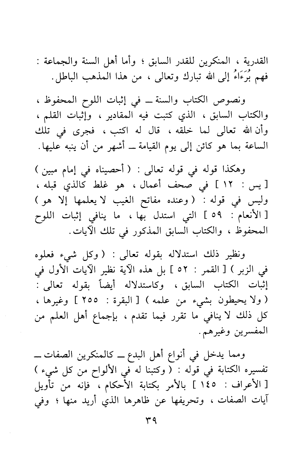 ونظير ذلك استدلاله بقوله تعالى: {وَكُلُّ شَيْءٍ فَعَلُوهُ فِي الزُّبُرِ} [سورة القمر آية: 52] ، بل هذه الآية نظير الآيات الأول في إثبات الكتاب السابق، وكاستدلاله أيضا بقوله تعالى: {وَلا يُحِيطُونَ بِشَيْءٍ مِنْ عِلْمِهِ} [سورة البقرة آية: 255] وغيرها، كل ذلك لا ينافي ما تقرر فيما تقدم، بإجماع أهل العلم من المفسرين وغيرهم.
