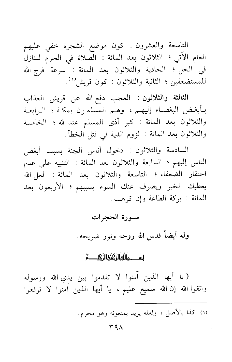الثالثة والثلاثون بعد المائة: العجب دفع الله عن قريش العذاب بأبغض البغضاء إليهم، وهم المسلمون بمكة الرابعة والثلاثون بعد المائة: كبر أذى المسلم عند الله.