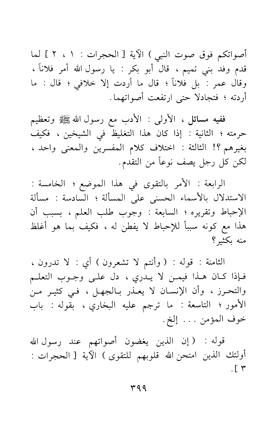 الثامنة: قوله: {وَأَنْتُمْ لا تَشْعُرُونَ} [سورة الحجرات آية: 2] أي: لا تدرون، فإذا كان هذا فيمن لا يدري، دل على وجوب التعلم والتحرز، وأن الإنسان لا يعذر بالجهل في كثير من الأمور.