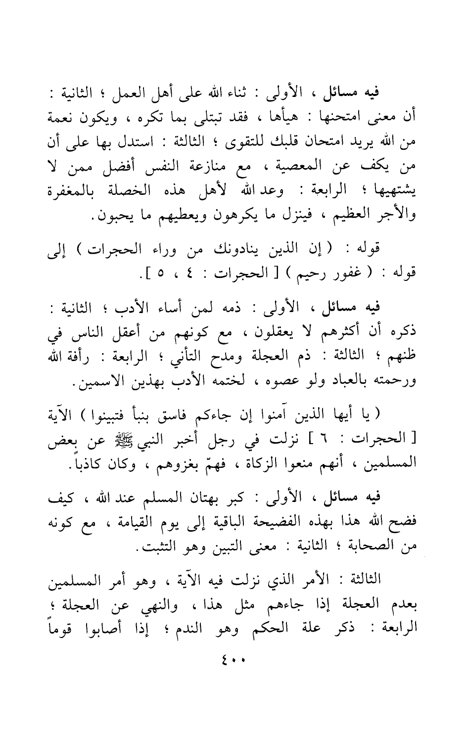 قوله: {إِنَّ الَّذِينَ يُنَادُونَكَ مِنْ وَرَاءِ الْحُجُرَاتِ} [سورة الحجرات آية: 4] إلى قوله: {غَفُورٌ رَحِيمٌ} [سورة الحجرات آية: 5] : فيه مسائل:
