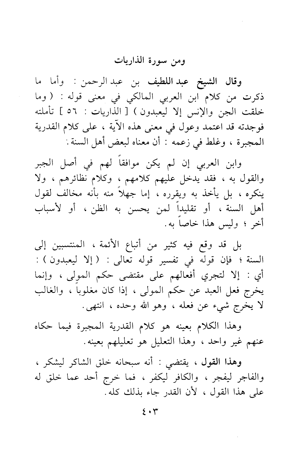 وقال الشيخ عبد اللطيف بن عبد الرحمن: وأما ما ذكرت من كلام ابن العربي المالكي في معنى قوله: {وَمَا خَلَقْتُ الْجِنَّ وَالأِنْسَ إِلا لِيَعْبُدُونِ} [سورة الذاريات آية: 56] : تأملته فوجدته قد اعتمد وعول في معنى هذه الآية على كلام القدرية المجبرة، وغلط في زعمه أن معناه لبعض أهل السنة.