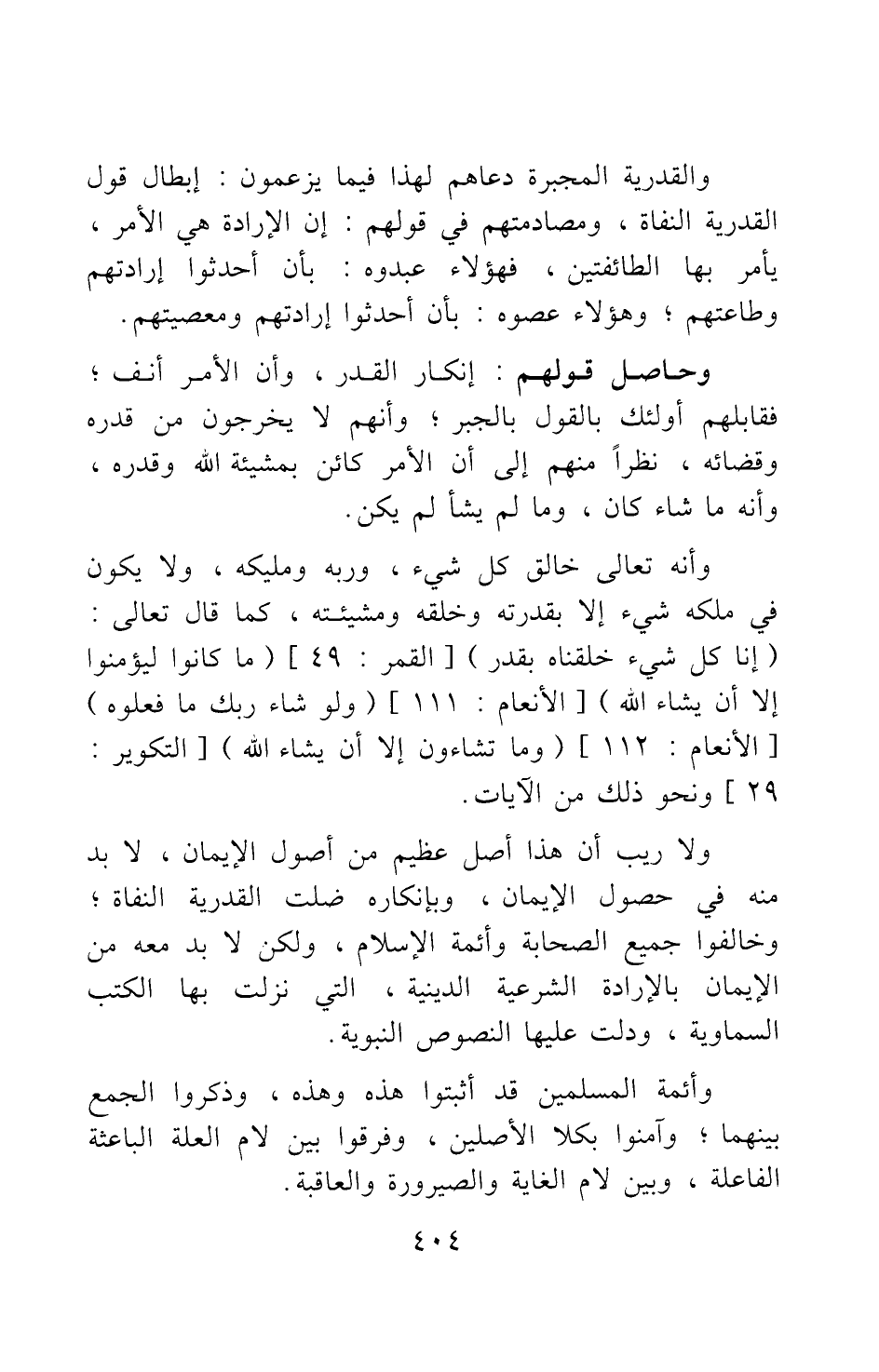 ولا ريب أن هذا أصل عظيم من أصول الإيمان، لا بد منه في حصول الإيمان؛ وبإنكاره ضلت القدرية النفاة، وخالفوا جميع الصحابة وأئمة الإسلام؛ ولكن لا بد معه من الإيمان بالإرادة الشرعية الدينية التي نزلت بها الكتب السماوية، ودلت عليها النصوص النبوية. وأئمة المسلمين قد أثبتوا هذه وهذه، وذكروا الجمع بينهما; وآمنوا بكلا الأصلين، وفرقوا بين لام العلة الباعثة الفاعلة، وبين لام الغاية والصيرورة والعاقبة.