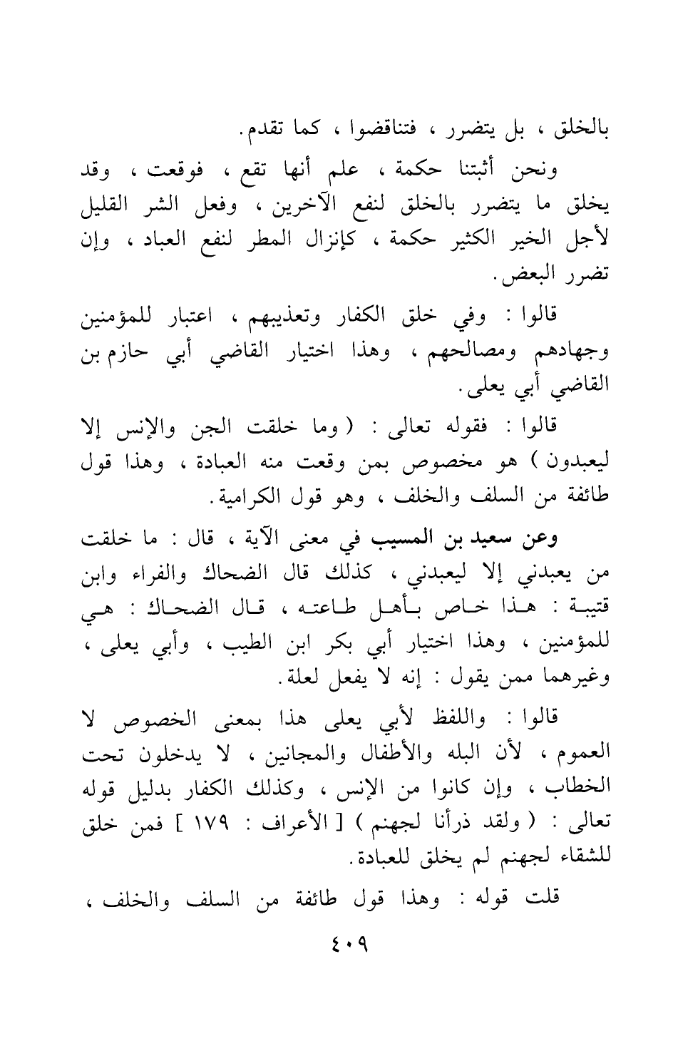 بالخلق، بل يتضرر، فتناقضوا، كما تقدم. ونحن أثبتنا حكمة علم أنها تقع، فوقعت، وقد يخلق ما يتضرر بالخلق لنفع الآخرين؛ وفعل الشر القليل لأجل الخير الكثير حكمة، كإنزال المطر لنفع العباد، وإن تضرر البعض. قالوا: وفي خلق الكفار وتعذيبهم اعتبار للمؤمنين وجهادهم ومصالحهم؛ وهذا اختيار القاضي أبي حازم بن القاضي أبي يعلى. قالوا: فقوله تعالى: {وَمَا خَلَقْتُ الْجِنَّ وَالأِنْسَ إِلاّ لِيَعْبُدُونِ} [سورة الذاريات آية: 56] هو مخصوص بمن وقعت منه العبادة، وهذا قول طائفة من السلف والخلف، وهو قول الكرامية. وعن سعيد بن المسيب في معنى الآية قال: ما خلقت من يعبدني إلا ليعبدني، كذلك قال الضحاك والفراء وابن قتيبة; هذا خاص بأهل طاعته. قال الضحاك: هي للمؤمنين، وهذا اختيار أبي بكر بن الطيب، وأبي يعلى، وغيرهما ممن يقول: إنه لا يفعل لعلة. قالوا: - واللفظ لأبي يعلى-: هذا بمعنى الخصوص لا العموم، لأن البله والأطفال والمجانين لا يدخلون تحت الخطاب، وإن كانوا من الإنس، وكذلك الكفار، بدليل قوله تعالى: {وَلَقَدْ ذَرَأْنَا لِجَهَنَّمَ} [سورة الأعراف آية: 179] ؛ فمن خلق للشقاء لجهنم يخلق للعبادة. قلت: قوله: وهذا قول طائفة من السلف والخلف،