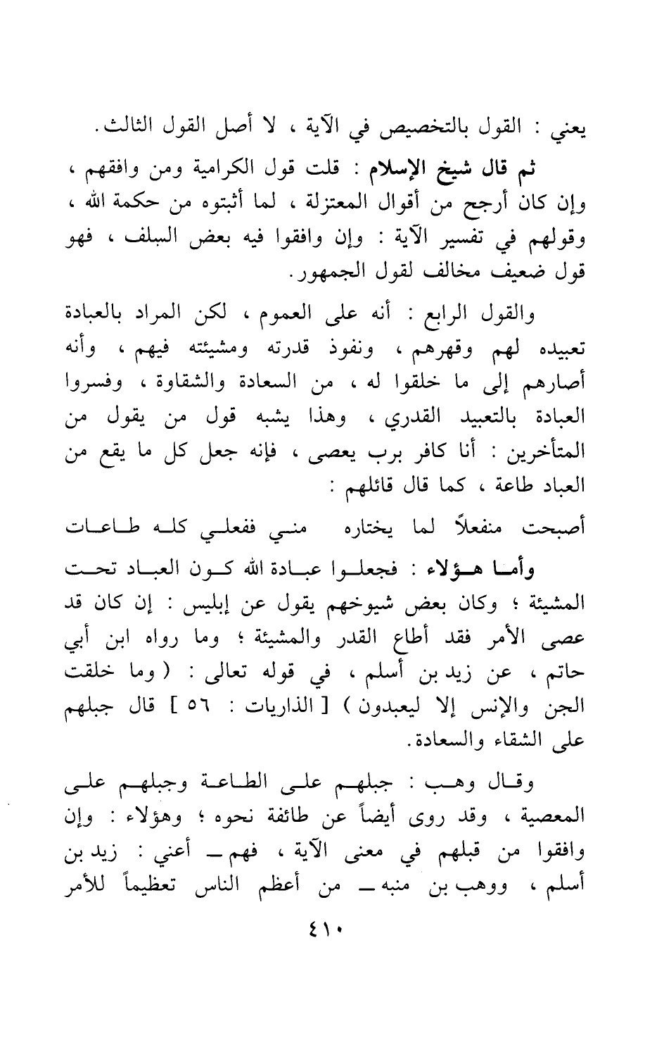 وأما هؤلاء: فجعلوا عبادة الله كون العباد تحت المشيئة; وكان بعض شيوخهم يقول عن إبليس: إن كان قد عصى الأمر فقد أطاع القدر والمشيئة; وما رواه ابن أبي حاتم عن زيد بن أسلم، في قوله تعالى: {وَمَا خَلَقْتُ الْجِنَّ وَالأِنْسَ إِلاّ لِيَعْبُدُونِ} [سورة الذاريات آية: 56] قال: "جبلهم على الشقاء والسعادة".