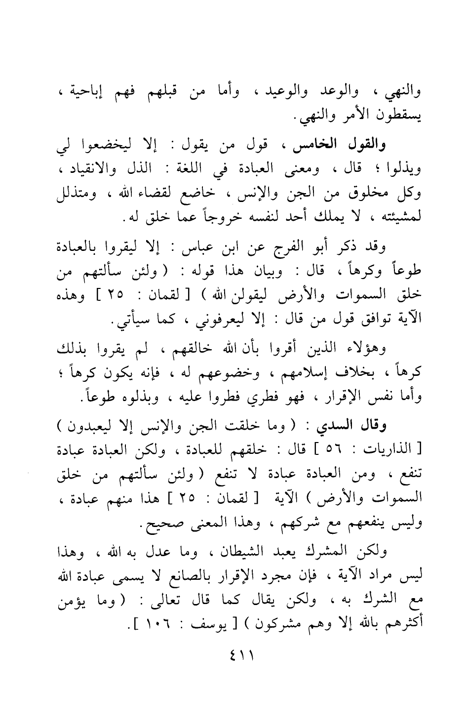 وقد ذكر أبو الفرج عن ابن عباس: "إلا ليقروا بالعبادة طوعا وكرها"، قال: وبيان هذا قوله: {وَلَئِنْ سَأَلْتَهُمْ مَنْ خَلَقَ السَّمَاوَاتِ وَالأَرْضَ لَيَقُولُنَّ اللَّهُ [سورة لقمان آية: 25] ، وهذه الآية توافق قول من قال: إلا ليعرفوني، كما سيأتي.