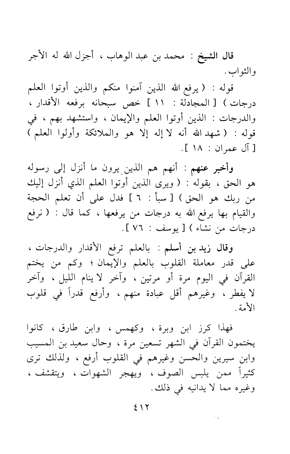 وأخبر عنهم أنهم هم الذين يرون ما أنزل إلى رسوله هو الحق، بقوله: {وَيَرَى الَّذِينَ أُوتُوا الْعِلْمَ الَّذِي أُنْزِلَ إِلَيْكَ مِنْ رَبِّكَ هُوَ الْحَقَّ} [سورة سبأ آية: 6] ، فدل على أن تعلم الحجة والقيام بها يرفع الله به درجات من يرفعها، كما قال: {نَرْفَعُ دَرَجَاتٍ مَنْ نَشَاءُ} [سورة الأنعام آية: 83] . وقال زيد بن أسلم: "بالعلم ترفع الأقدار والدرجات، على قدر معاملة القلوب بالعلم والإيمان; وكم من يختم القرآن في اليوم مرة أو مرتين، وآخر لا ينام الليل، وآخر لا يفطر، وغيرهم أقل عبادة منهم، وأرفع قدرا في قلوب الأمة".