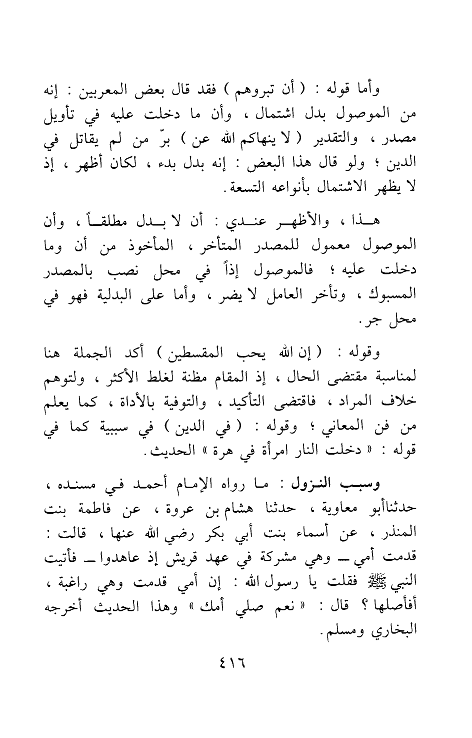 وسبب النّزول: ما رواه الإمام أحمد في مسنده، حدثنا أبو معاوية، حدثنا هشام بن عروة، عن فاطمة بنت المنذر، عن أسماء بنت أبي بكر رضي الله عنها، قالت: " قدمت أمي - وهي مشركة في عهد قريش إذ عاهدوا - فأتيت النبي صلى الله عليه وسلم فقلت: يا رسول الله، إن أمي قدمت وهي راغبة، أفأصلها؟ قال: نعم صلي أمك " 2 وهذا الحديث أخرجه البخاري ومسلم.