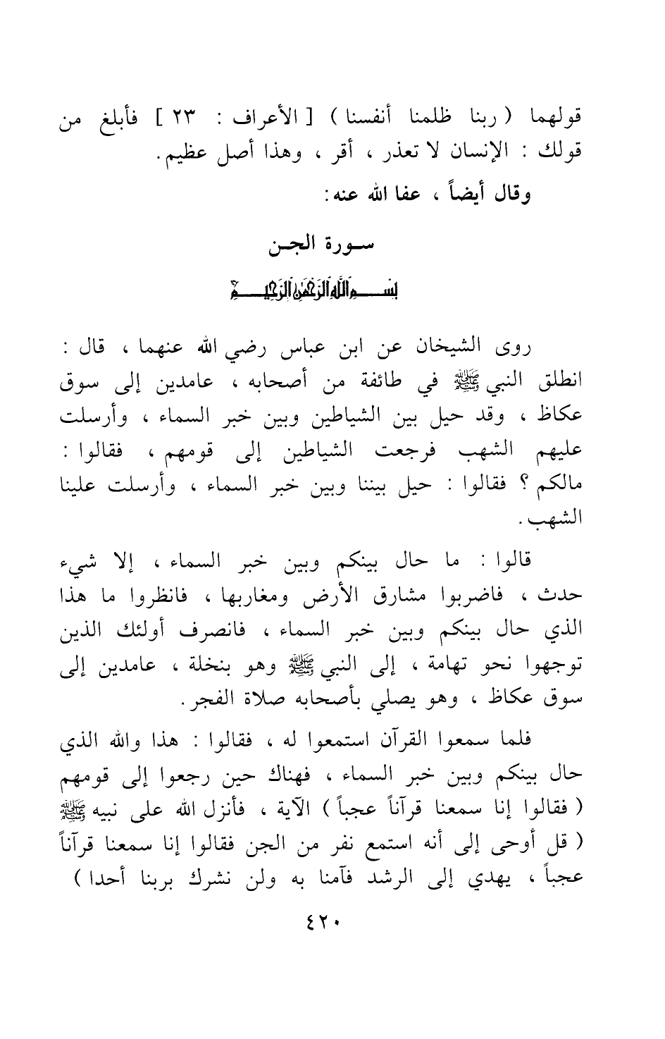 روى الشيخان عن ابن عباس رضي الله عنهما، قال: " انطلق النبي صلى الله عليه وسلم في طائفة من أصحابه، عامدين إلى سوق عكاظ، وقد حيل بين الشياطين وبين خبر السماء، وأرسلت عليهم الشهب، فرجعت الشياطين إلى قومهم، فقالوا: ما لكم؟ فقالوا: حيل بيننا وبين خبر السماء، وأرسلت علينا الشهب. قالوا: ما حال بينكم وبين خبر السماء، إلا شيء حدث، فاضربوا مشارق الأرض ومغاربها، فانظروا ما هذا الذي حال بينكم وبين خبر السماء. فانصرف أولئك الذين توجهوا نحو تهامة، إلى النبي صلى الله عليه وسلم وهو بنخلة، عامدين إلى سوق عكاظ، وهو يصلي بأصحابه صلاة الفجر. فلما سمعوا القرآن استمعوا له، فقالوا: هذا والله الذي حال بينكم وبين خبر السماء. فهناك حين رجعوا إلى قومهم {فَقَالُوا إِنَّا سَمِعْنَا قُرْآناً عَجَباً} [سورة الجن آية: 1] 1 الآية، فأنزل الله على نبيه صلى الله عليه وسلم: {قل أُوحِيَ إِلَيَّ أَنَّهُ اسْتَمَعَ نَفَرٌ مِنَ الْجِنِّ فَقَالُوا إِنَّا سَمِعْنَا قُرْآناً عَجَباً يَهْدِي إِلَى الرُّشْدِ فَآمَنَّا بِهِ وَلَنْ نُشْرِكَ بِرَبِّنَا أَحَداً}