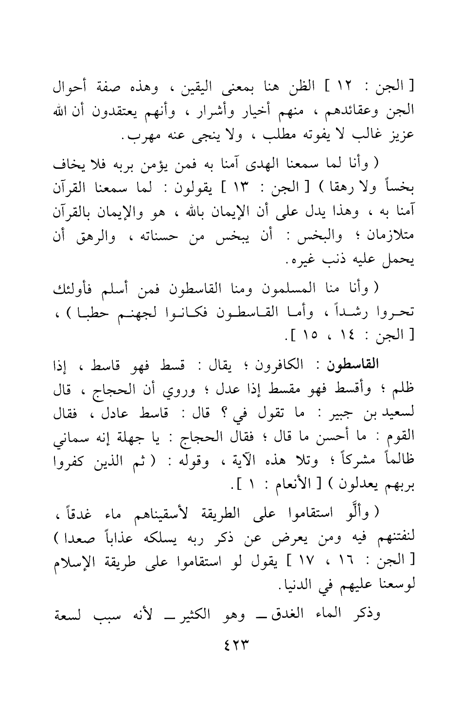 {وَأَنَّا مِنَّا الْمُسْلِمُونَ وَمِنَّا الْقَاسِطُونَ فَمَنْ أَسْلَمَ فَأُولَئِكَ تَحَرَّوْا رَشَداً وَأَمَّا الْقَاسِطُونَ فَكَانُوا لِجَهَنَّمَ حَطَباً} [سورة الجن آية: 14-15] القاسطون: الكافرون; يقال: قسط فهو قاسط، إذا ظلم; وأقسط فهو مقسط إذا عدل; وروي أن الحجاج قال لسعيد بن جبير: ما تقول في؟ قال: "قاسط عادل"، فقال القوم: ما أحسن ما قال! فقال الحجاج: يا جهلة إنه سماني ظالما مشركا; وتلا هذه الآية، وقوله: {ثُمَّ الَّذِينَ كَفَرُوا بِرَبِّهِمْ يَعْدِلُونَ} [سورة الأنعام آية: 1] . {وَأَلَّوِ اسْتَقَامُوا عَلَى الطَّرِيقَةِ لأَسْقَيْنَاهُمْ مَاءً غَدَقاً لِنَفْتِنَهُمْ فِيهِ وَمَنْ يُعْرِضْ عَنْ ذِكْرِ رَبِّهِ يَسْلُكْهُ عَذَاباً صَعَداً} [سورة الجن آية: 16-17] : يقول: لو استقاموا على طريقة الإسلام لوسعنا عليهم في الدنيا. وذكر الماء الغدق - وهو الكثير - لأنه سبب لسعة