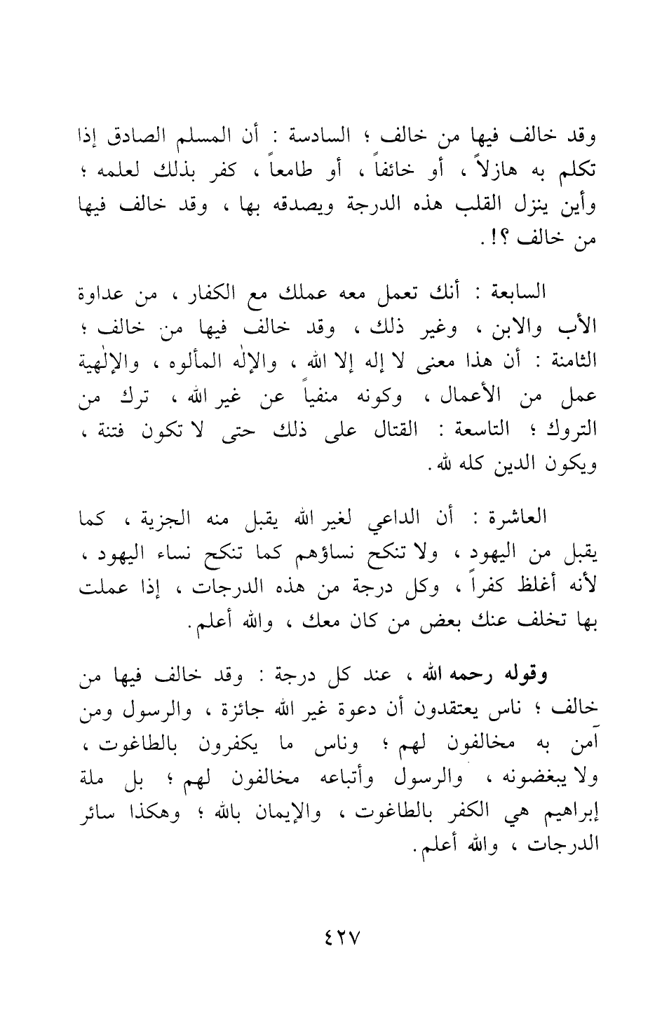 العاشرة: أن الداعي لغير الله يقبل منه الجزية، كما يقبل من اليهود، ولا تنكح نساؤهم كما تنكح نساء اليهود، لأنه أغلظ كفرا؛ وكل درجة من هذه الدرجات، إذا عملت بها تخلف عنك بعض من كان معك. والله أعلم. وقوله رحمه الله، عند كل درجة: