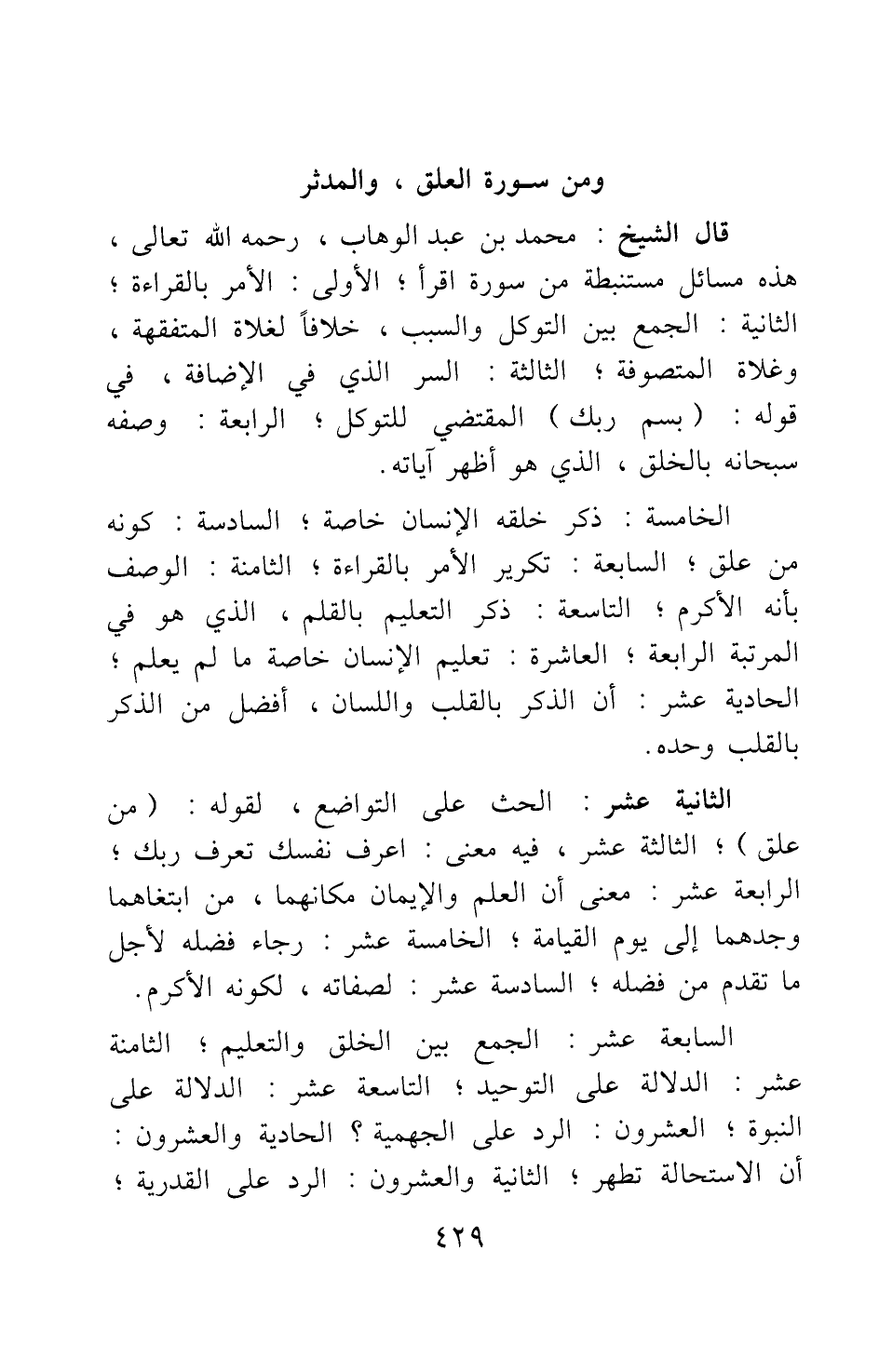 قال الشيخ محمد بن عبد الوهاب، رحمه الله تعالى: هذه مسائل مستنبطة من سورة اقرأ: الأولى: الأمر بالقراءة.