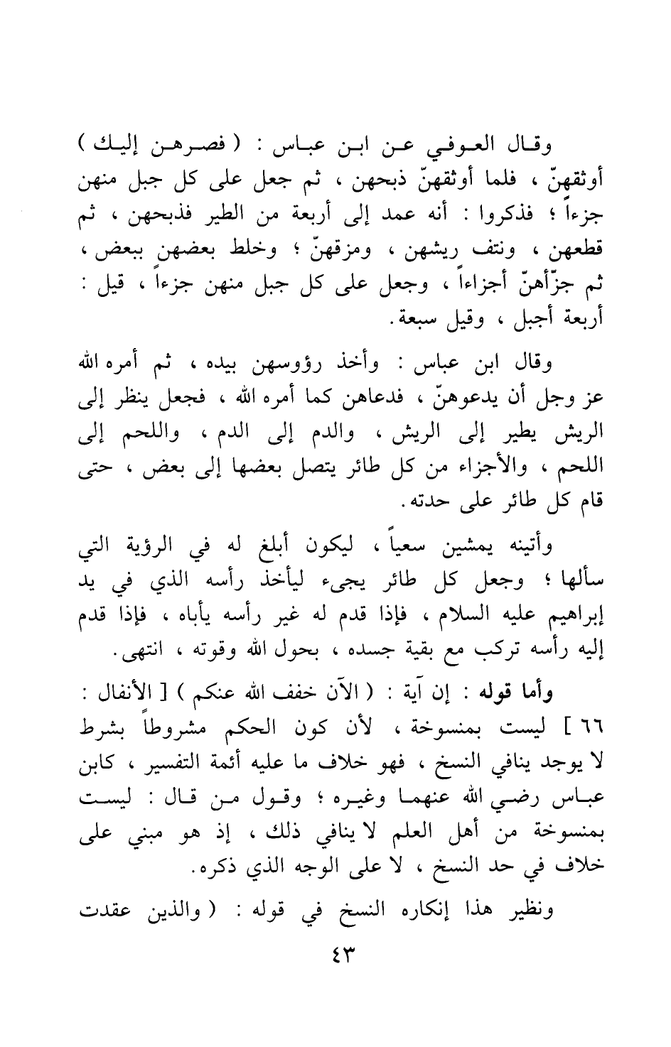 وقال العوفي عن ابن عباس: {فَصُرْهُنَّ إِلَيْكَ} [سورة البقرة آية: 260] : أوثقهن، فلما أوثقهن ذبحهن، ثم جعل على كل جبل منهن جزءا ; فذكروا: أنه عمد إلى أربعة من الطير فذبحهن، ثم قطعهن، ونتف ريشهن، ومزقهن ; وخلط بعضهن ببعض، ثم جزأهن أجزاء، وجعل على كل جبل منهن جزءا، قيل: أربعة أجبل، وقيل سبعة.