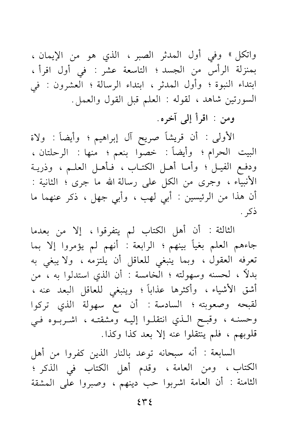 الأولى: أن قريشا صريح آل إبراهيم، وأيضا ولاة البيت الحرام; وأيضا خصوا بنعم: منها: الرحلتان، ودفع الفيل. وأما أهل الكتاب: فأهل العلم، وذرية الأنبياء؛ وجرى من الكل على رسالة الله ما جرى.