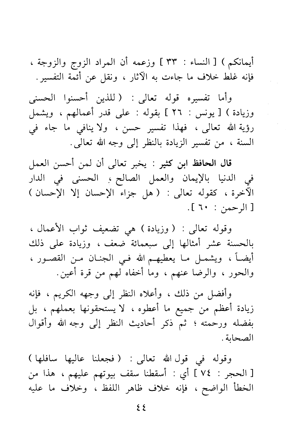 وأما تفسيره قوله تعالى: {لِلَّذِينَ أَحْسَنُوا الْحُسْنَى وَزِيَادَةٌ} [سورة يونس آية: 26] بقوله: على قدر أعمالهم، ويشمل رؤية الله تعالى، فهذا تفسير حسن، ولا ينافي ما جاء في السنة من تفسير الزيادة بالنظر إلى وجه الله تعالى.