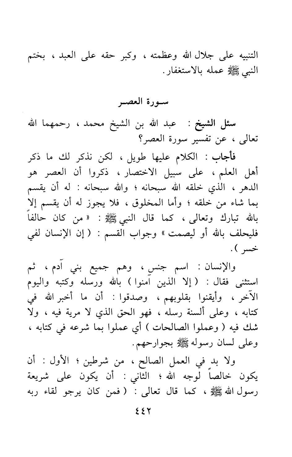 سئل الشيخ عبد الله بن الشيخ محمد، رحمهما الله تعالى، عن تفسير سورة العصر؟